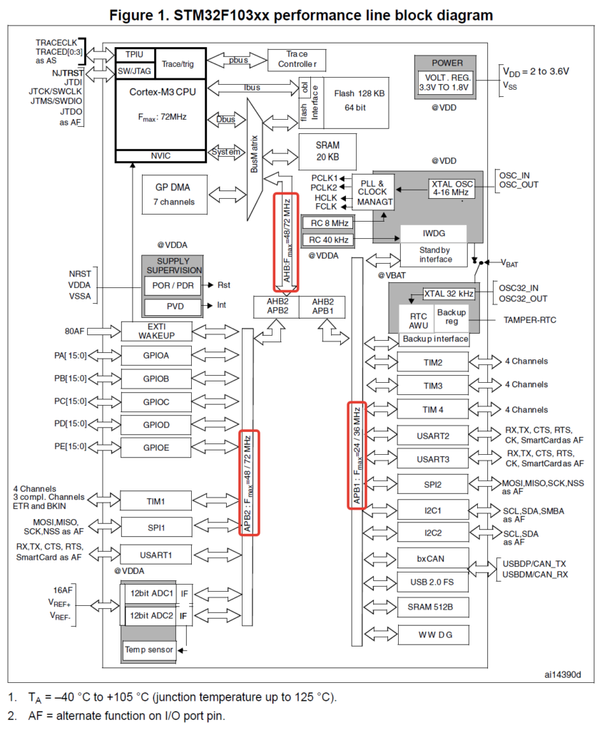 В даташите на STM32F103x8 есть блок-схема, в которой указано, какая периферия куда подключена: