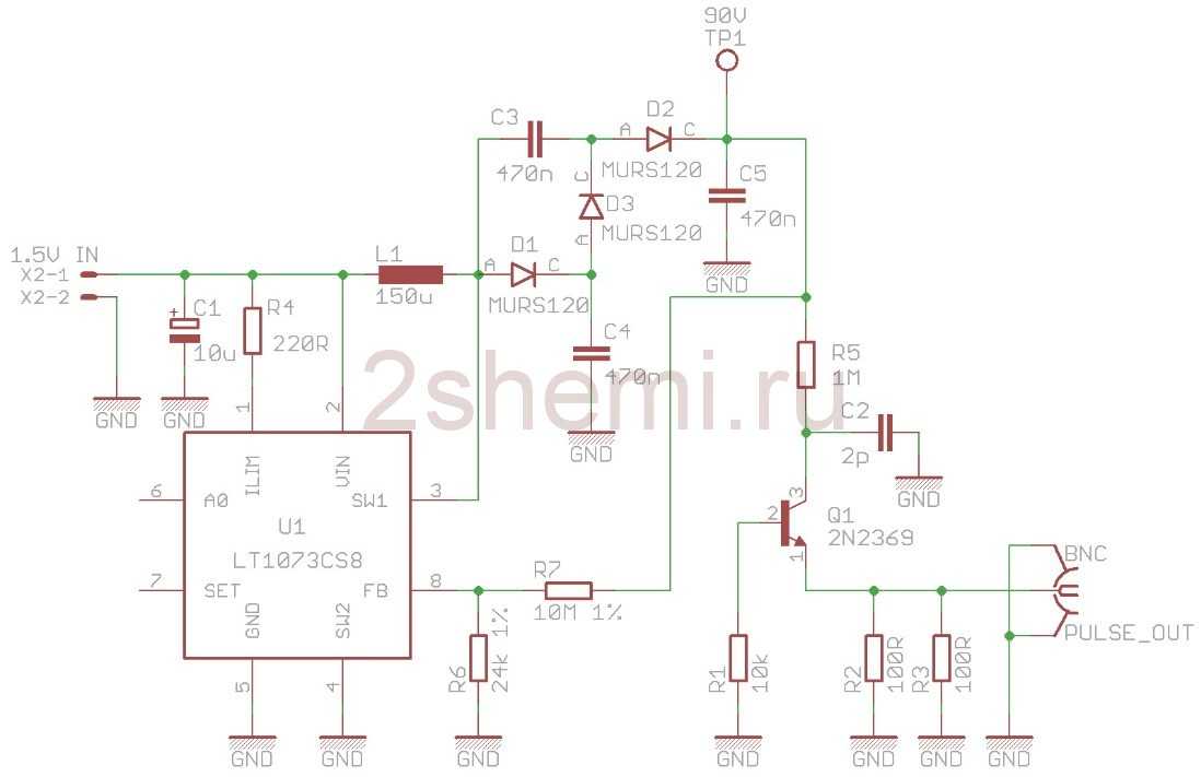 Вся схема основана на двух блоках. Первый блок представляет собой DC-DC преобразователь и он построен с использованием микросхемы LT1073, второй блок представляет собой генератора на базе транзистора 2N2369A от Моторола. Инвертор объекта подает переменное напряжение, которое затем повышается в цепи умножителя диодного напряжения (диоды D1-D3) до значения 90 В. Затем с этим напряжением работает импульсная генераторная схема.