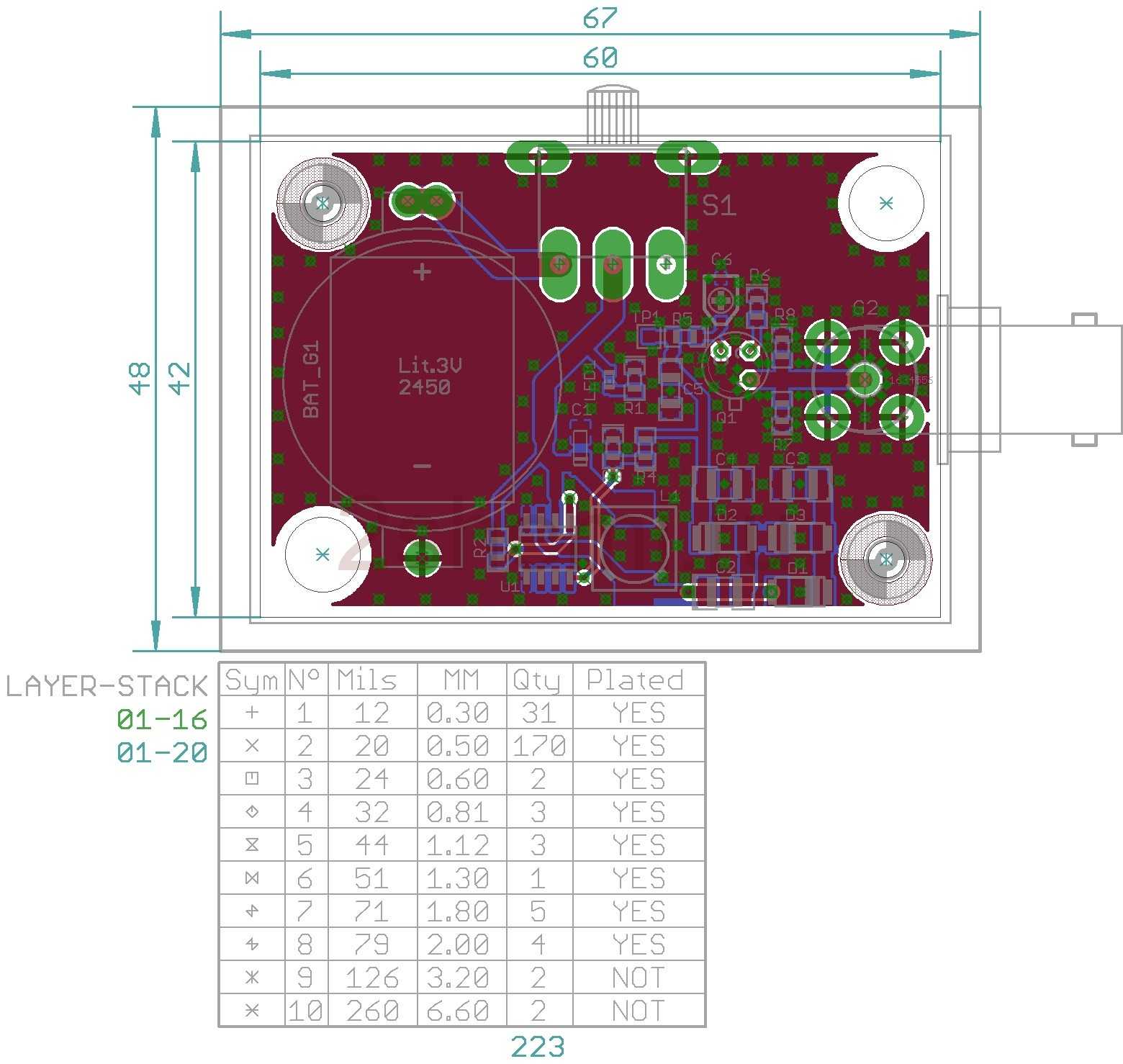 Печатная плата генератора очень маленькая, на 42×18 мм. Сама схема может питаться напряжением от 1,5 до 3 В, в данном случае использовалась литиевая батарея CR2450. Весь генератор потребляет 5 мА и используя устройство в течение года, напряжение батареи остается на уровне 3 В. Конечно, если кто-то будет использовать его интенсивно, батарея быстро перестанет быстро обеспечивать требуемое напряжение.