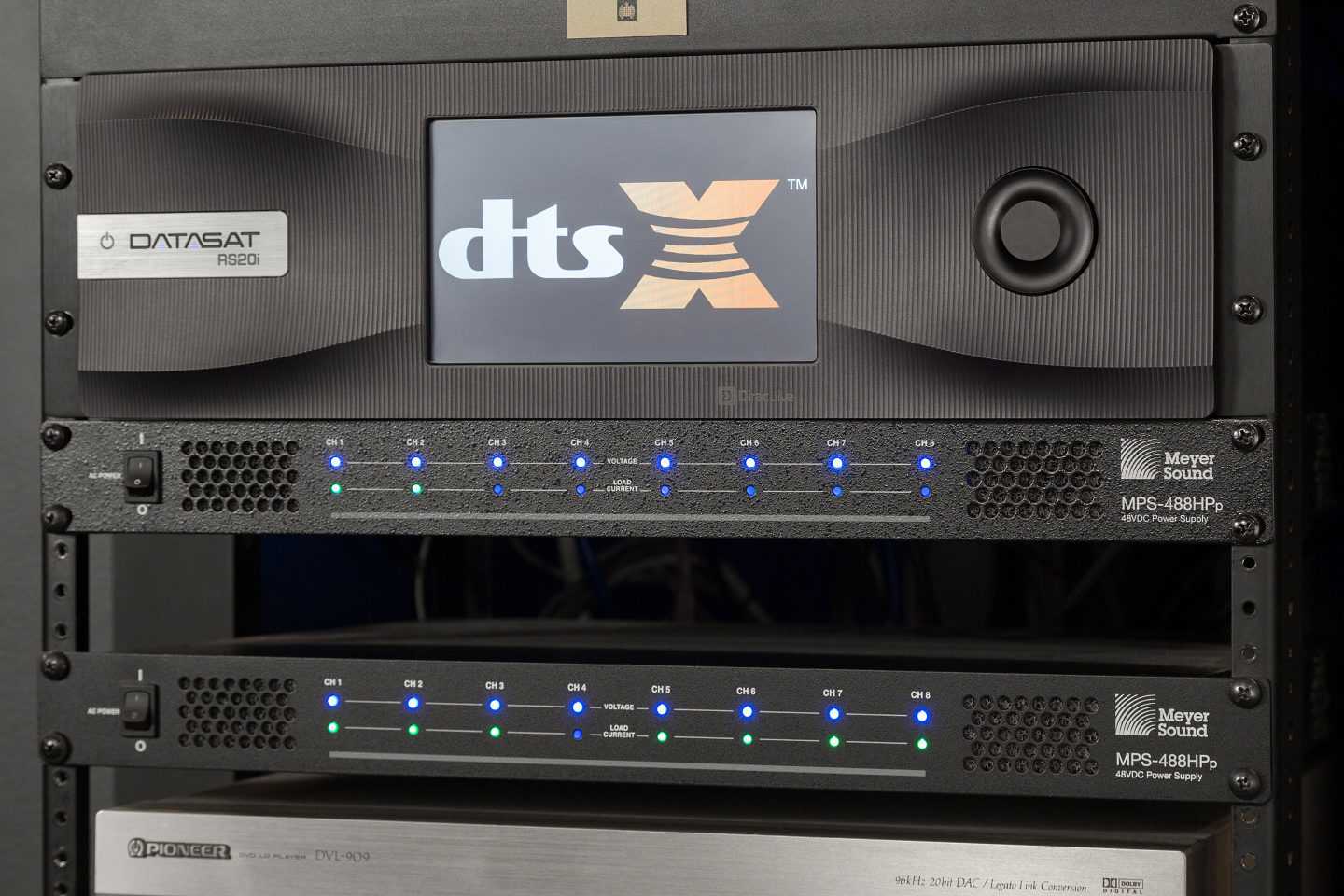 Пара блоков Meyer Sound MPS-488HPp предназначены для питания встроенных в акустику усилителей. Над ними в рэковой стойке разместился процессор Datasat RS20i