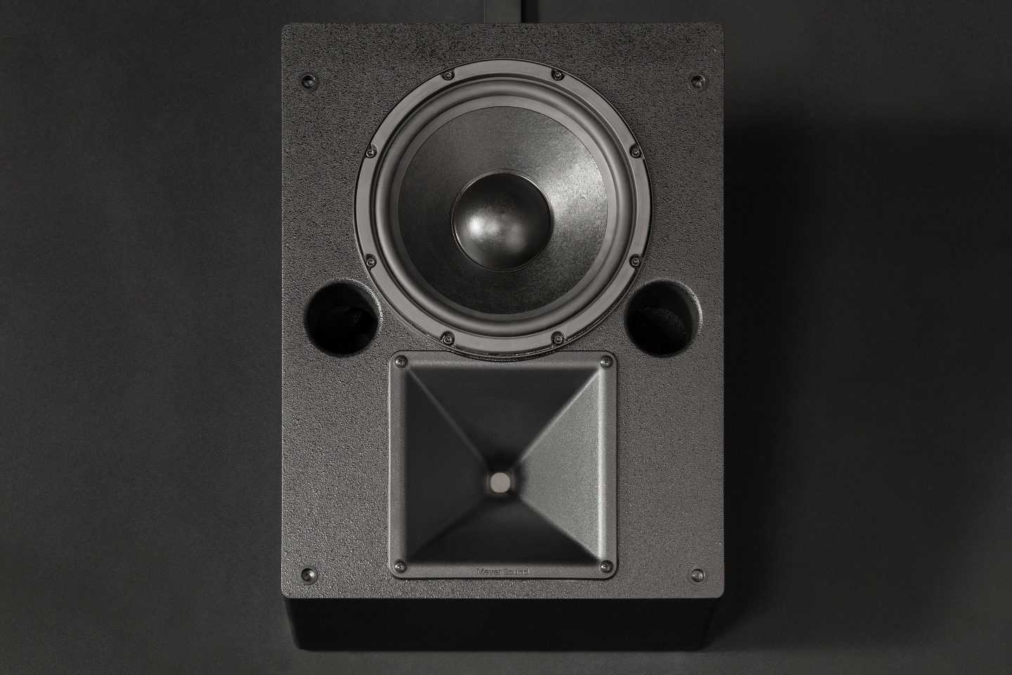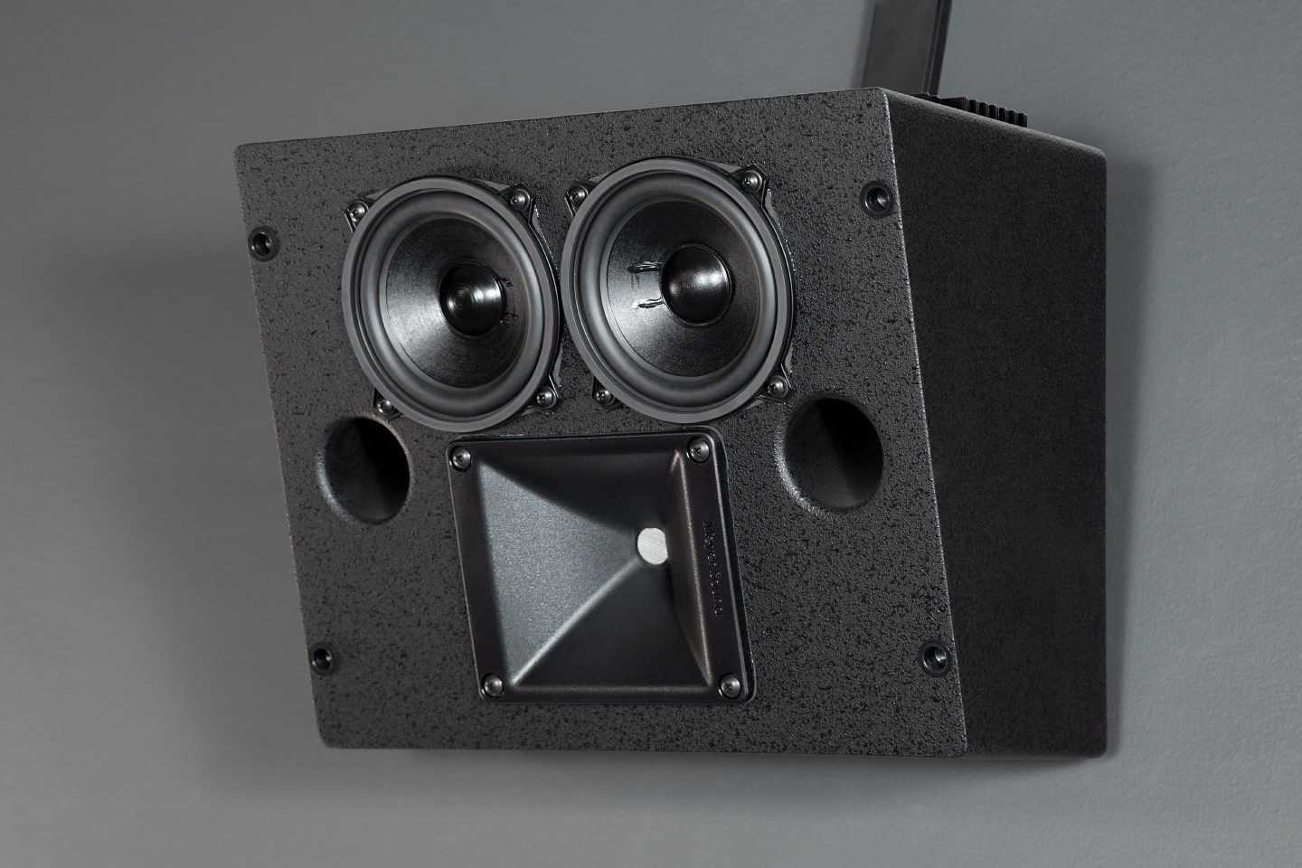 Верхний фронт в системе — пара Meyer Sound HMS-10 с 10-дюймовыми низкочастотниками и 2-дюймовыми драйверами. Боковые и тыловые каналы — HMS-5 — младшенькие в серии колонки, оснащенные парой 5-дюймовых низкочастотников и рупорными драйверами с 2-дюймовыми диафрагмами. Соответственно, рупора у этих двух моделей немного другие, с меньшим градусом, а активная схема и внешнее питание сделаны в общих чертах по уже известной схеме.