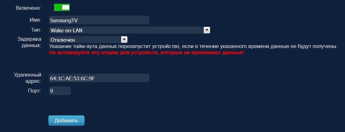 Вводим имя устройства, на которое будем нажимать для включения телевизора и повторно МАС адрес. Жмем кнопку добавить.