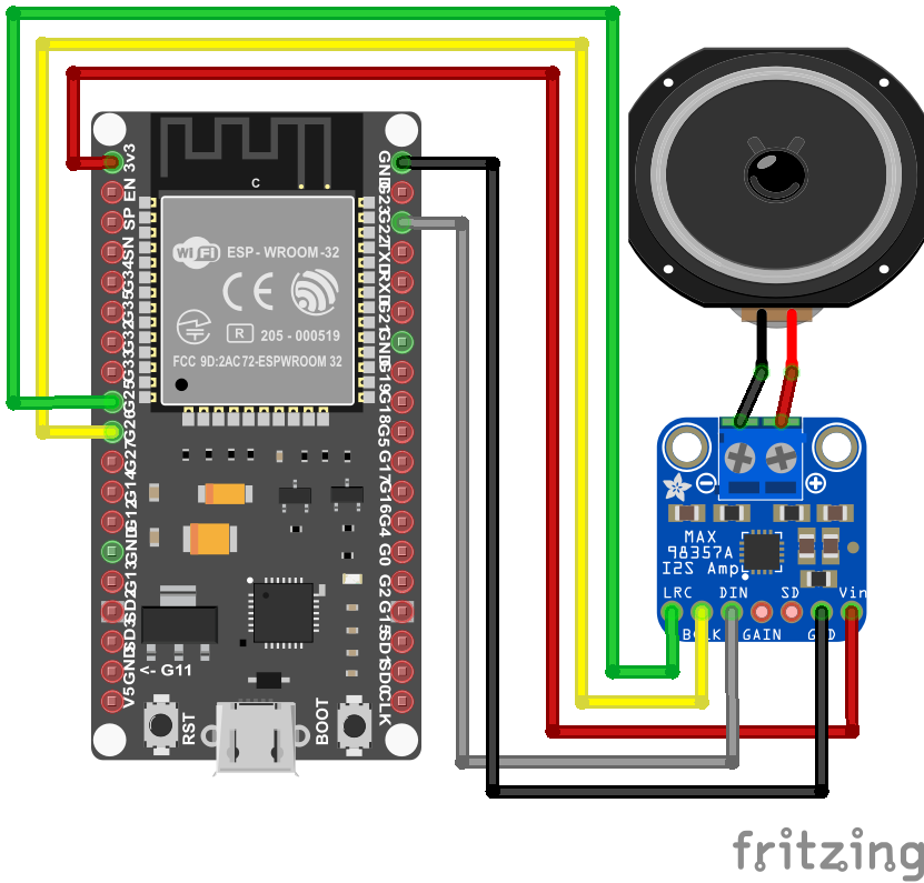На следующем рисунке показана проводка между ESP32 NodeMCU, коммутационной платой MAX98357 I2S и динамиком.