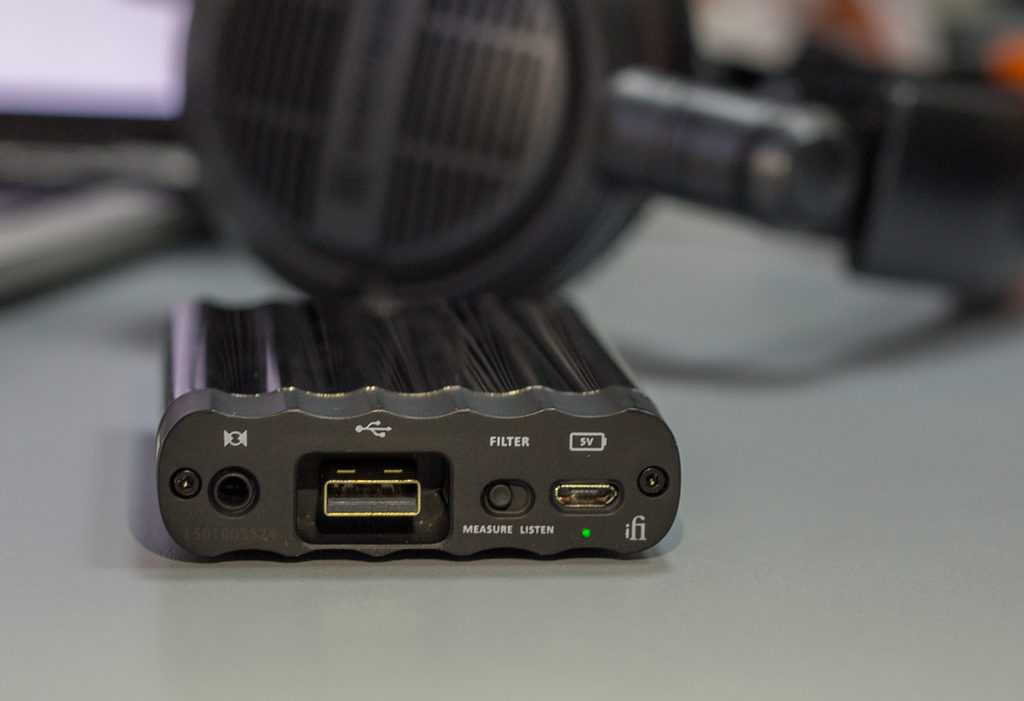 На задней панели, помимо гнезда зарядки (micro-USB), расположился полноценный USB-вход (Type -A) и разъем входа mini-S / PDIF. Есть еще переключатель цифровых фильтров «Measure» и «Listen». Кстати, за информацию о состоянии заряда устройства отвечает маленький светодиод под входом micro-USB. Емкость аккумулятора составляет 2200 мАч, после полной зарядки устройство работает чуть более 6 часов.
