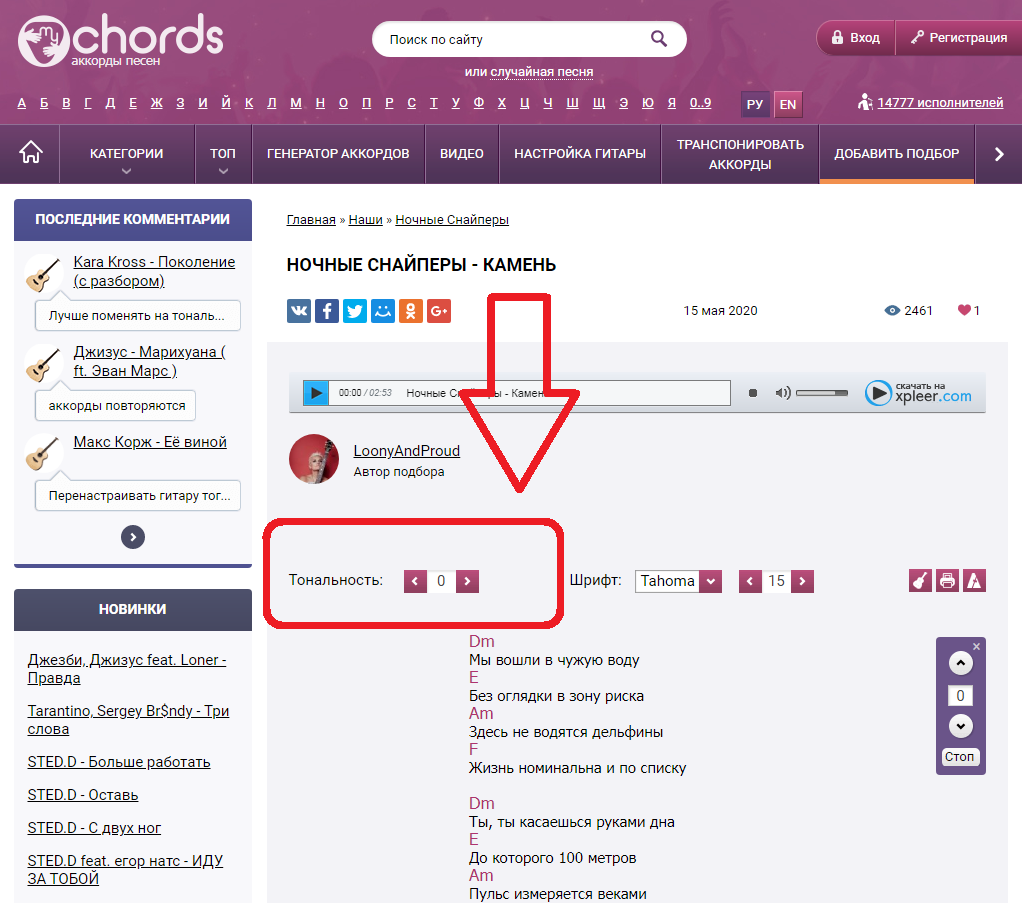 Когда вы зайдете на страничку с нужной композицией, вы сразу увидите окошко «Тональность» со стрелочками вправо (на повышение) и влево (на понижение):