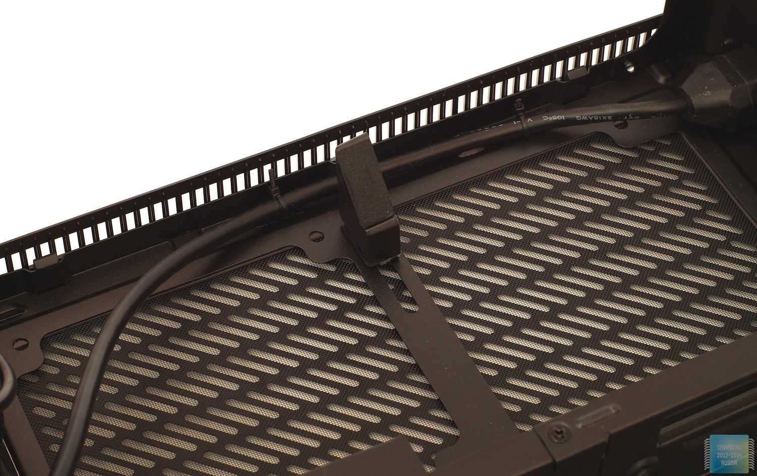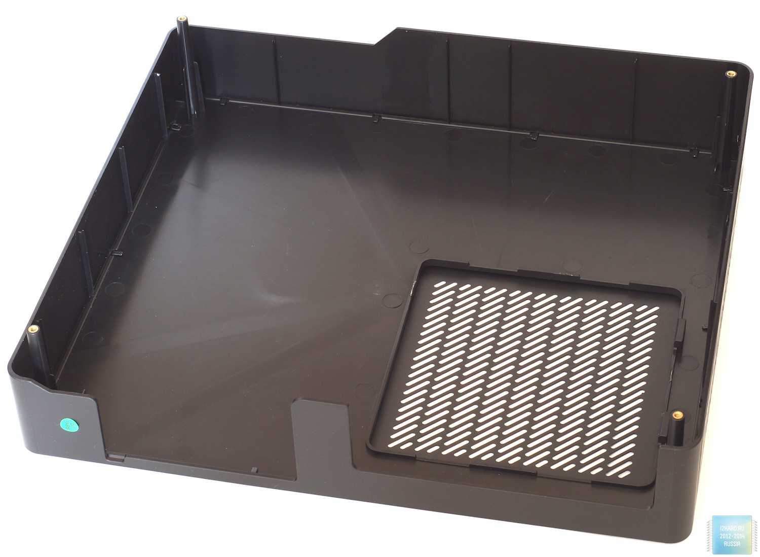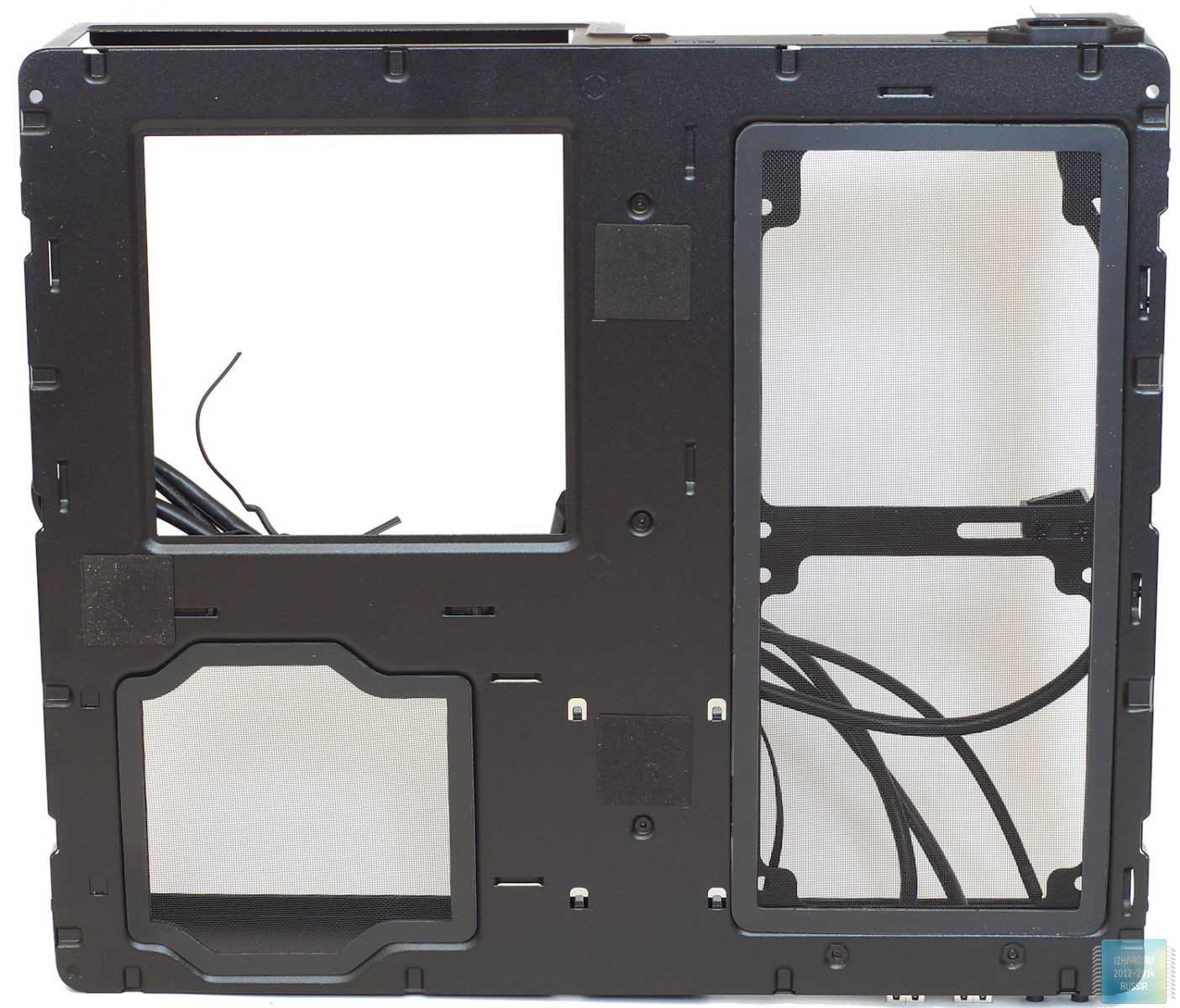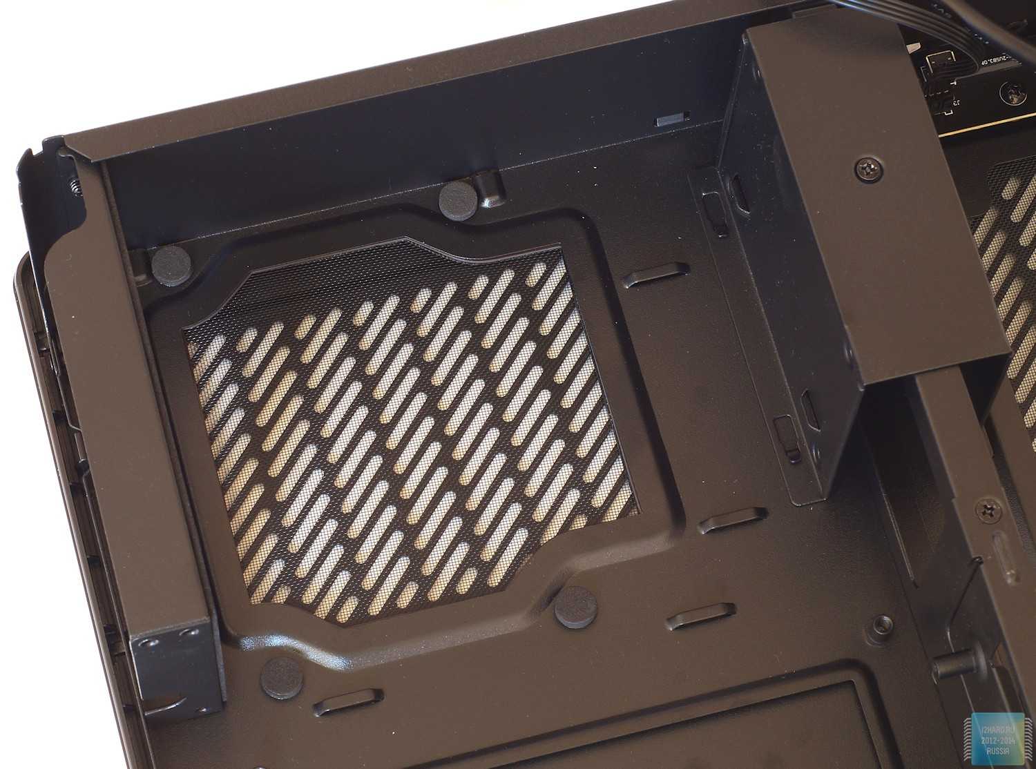 К одной из них, на защелках, крепится основное металлическое шасси. Два противопылевых фильтра (для области видеокарты и блока питания) фиксируются на шасси с помощью рамок-магнитов, что делает процедуру их снятия очень простой. Чтобы «не дребезжать» и «не провисать» на нижней части шасси имеются три мягких демпфера. Кстати, в шасси есть большое окнодля установки бекплейт кулера без демонтажа платы.