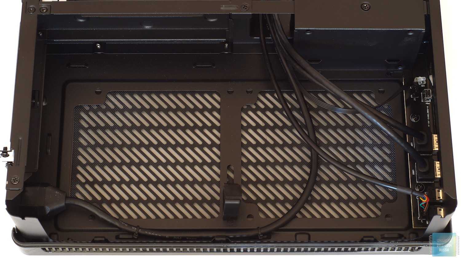Зона для материнской платы ничем особым не примечательна, видны тольковыступы на шасси для легкой фиксации прокладываемых кабелей стяжками и …