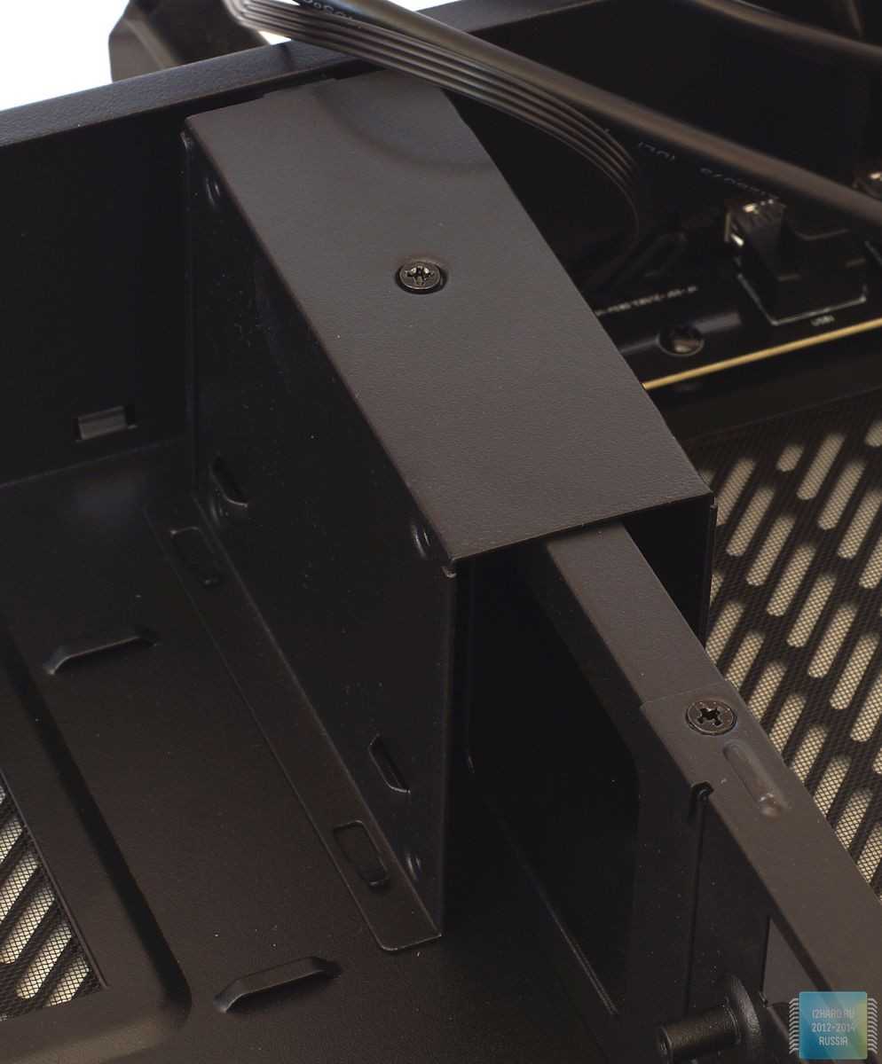 Рядом с ним же находится корзина под 2 x 2.5″ накопителя, которая фактически и ограничивает глубину блока питания. Для надежной фиксации прикручивается она одним винтом к перегородке. Установить 3.5″ накопители или внешний 5.25″ привод не получиться – такова плата за компактность.