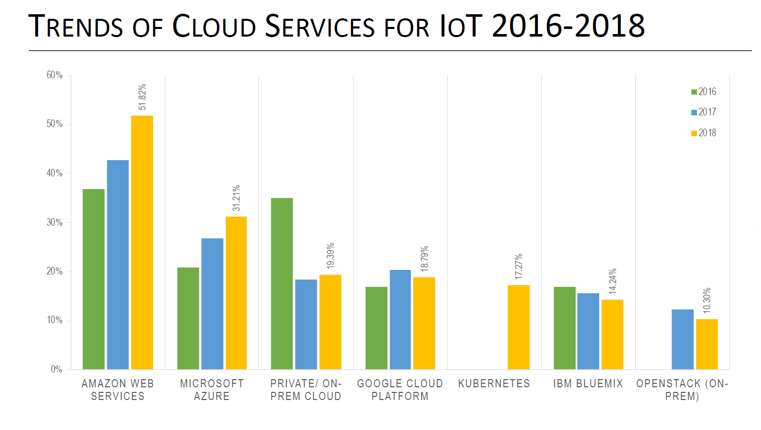 Из исследования IoT Developer Survey 2018 можно сделать еще несколько интересных выводов. Например, среди различных облачных сервисов IoT, Amazon Web Services (AWS) уверенно удерживает лидирующие позиции (см. рисунок ниже). Вторым по значению сервисом остается Microsoft Azure IoT.