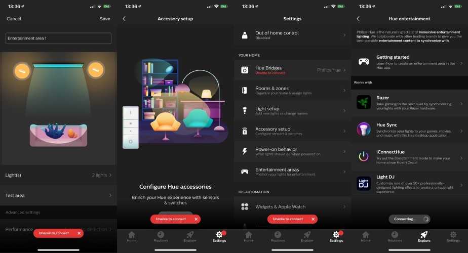 Controlling the Hue Play HDMI Sync Box requires the use of two apps. You have to use the regular Hue app to add bulbs, including the Hue Gradient. Note that the Gradient doesn’t appear in the app as a regular bulb that you can control, although you can turn it on and off using either Amazon Alexa or the Google Assistant.