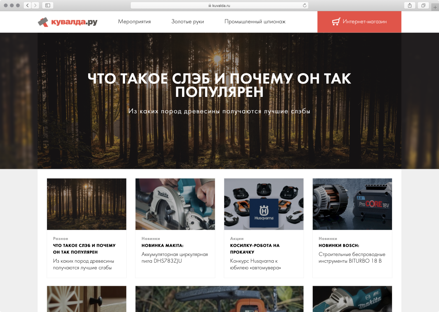 Онлайн-магазин «Кувалда.ру» торгует профессиональным инструментом и строительным оборудованием. В своем интернет-журнале он рассказывает про людей, которые своими руками создают уникальные вещи, и публикует репортажи с производств. Все это с большими и красивыми фото.