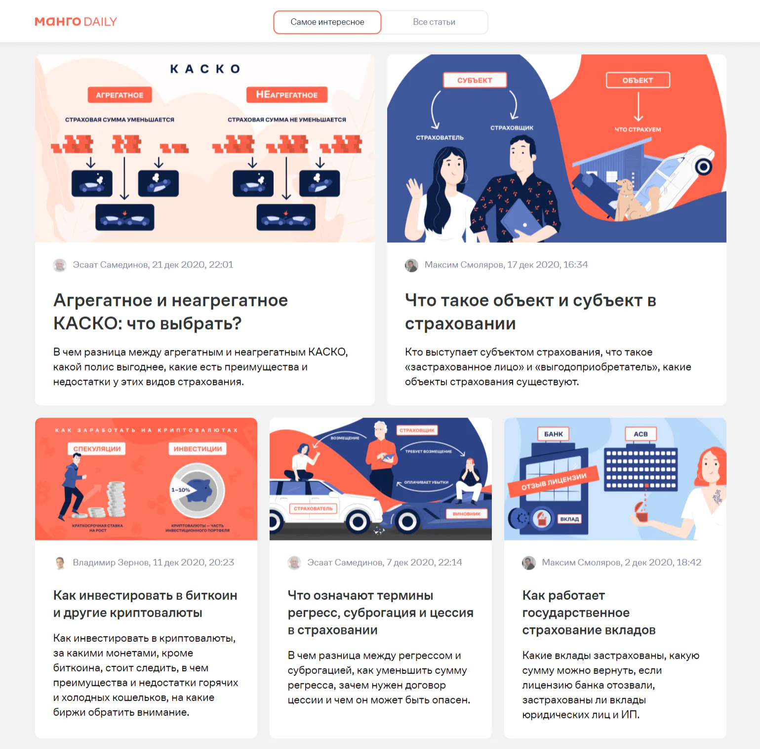 На примере ниже показан блог компании «Манго». Пользователь может найти здесь ответы на вопросы о страховании, а также полезные статьи о том, что делать в случае порчи имущества.