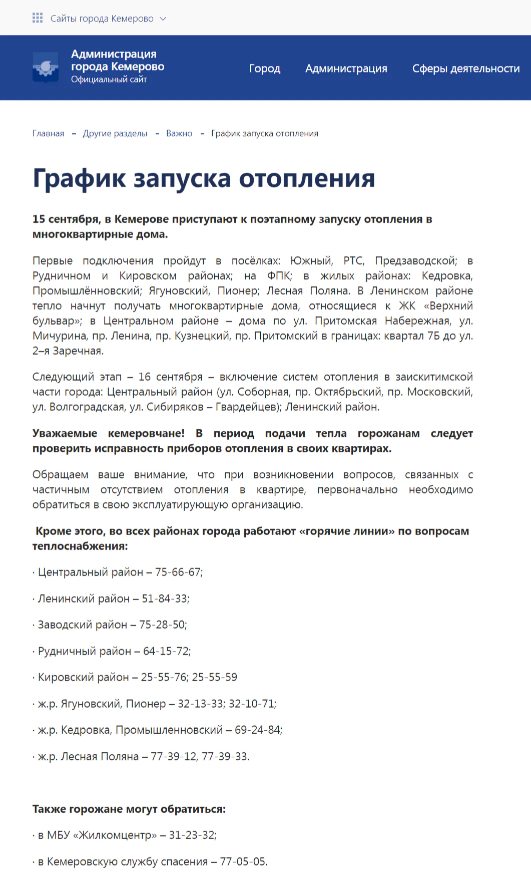 Пример пресс-релиза на сайте администрации города — в тексте дана информация о графике запуска отопления с указанием телефонов, по которым нужно обращаться в случае возникновения проблем.