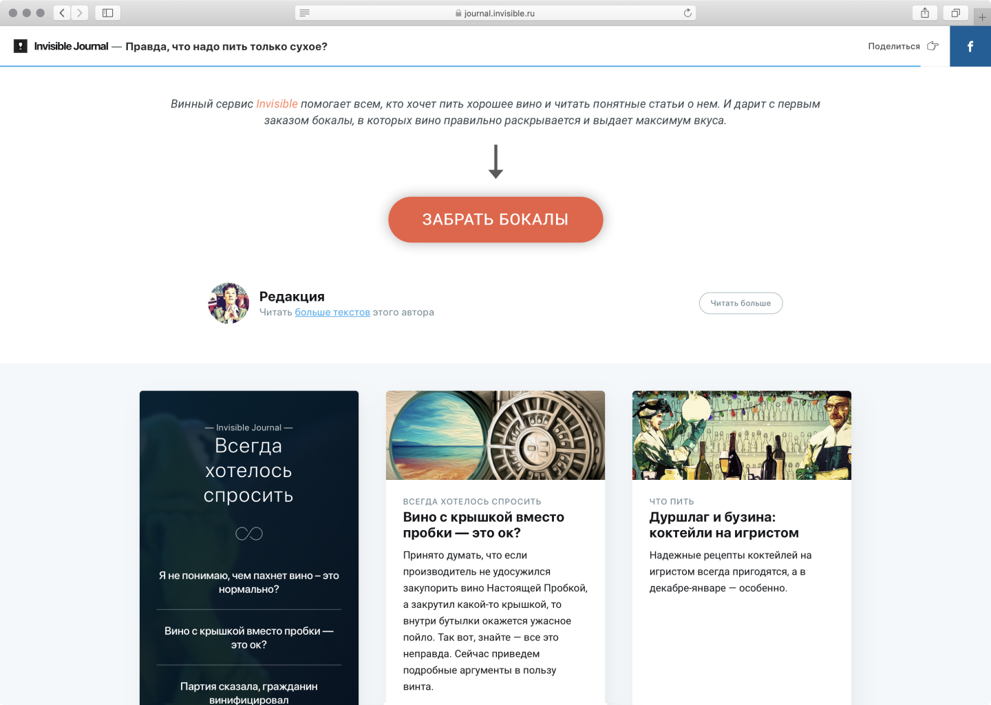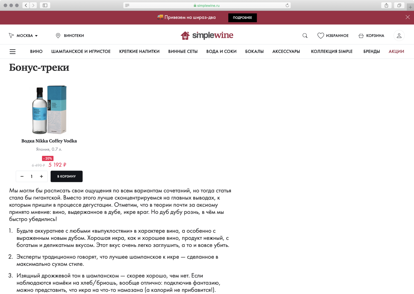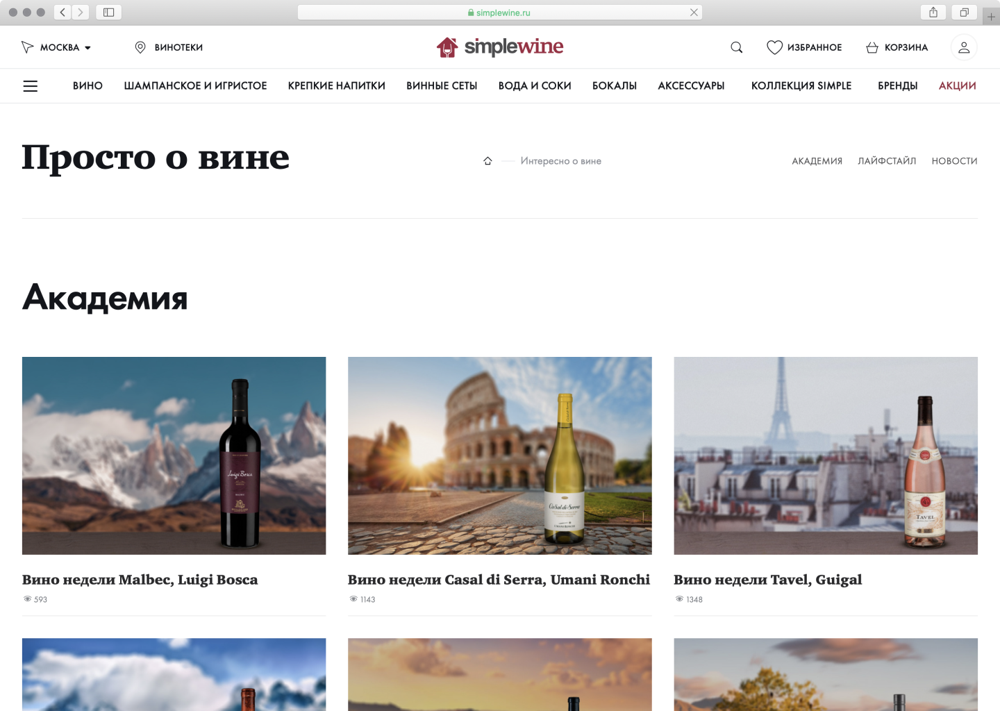Винный магазин SimpleWine встроил блог в свою главную станицу. Публикуют подборки, листиклы и списки вин, которые пьют селебрити вроде Артемия Лебедева и Ксении Собчак. В блоге есть также рубрика «Вопрос – Ответ», где рассказывают, почему icewine — сладкие, и бывают ли качественные вина с винтовой пробкой.
