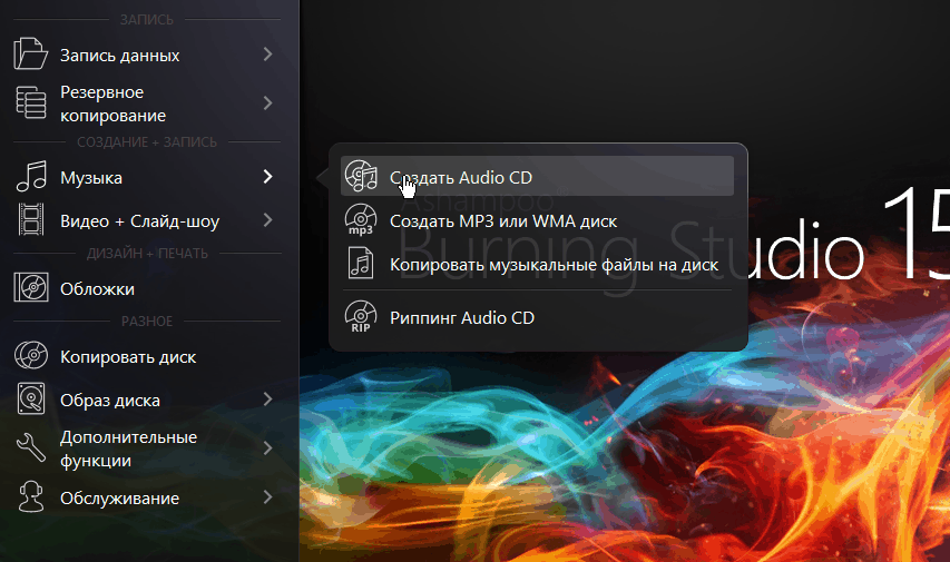 Все версии этого популярного программного продукта поддерживают создание Audio CD, в том числе и самая свежая 15 версия. Для начала конвертация необходимо запустить программу и выбрать соответствующие пункты меню: Музыка – Создание Audio CD.