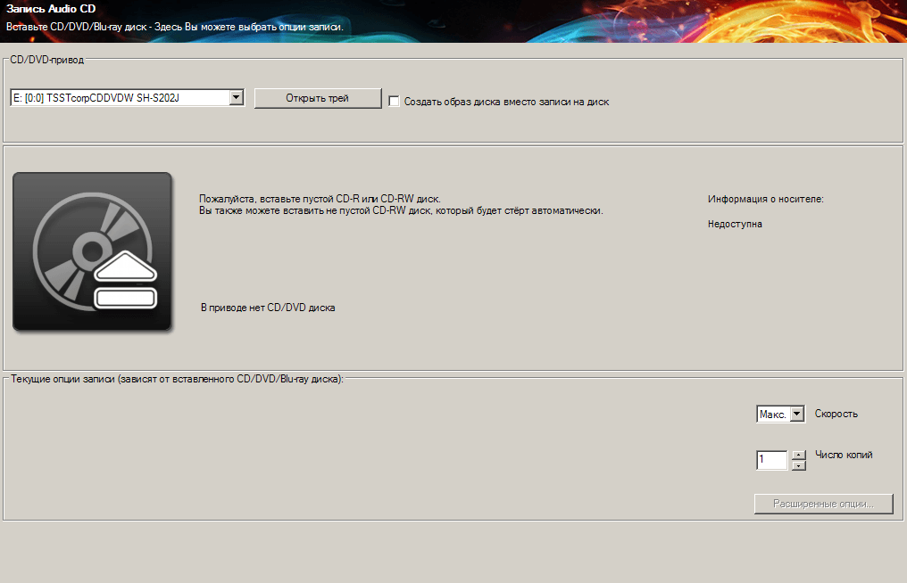 Теперь вставьте чистый диск (CD-R или CD-RW) в дисковод и подождите несколько секунд. Если в нижней части окна программы до этого отображалось «Нет диска», то сейчас должно отображаться: «CD-R (Пусто)». Последнее означает, что программа «увидела» вставленный диск.