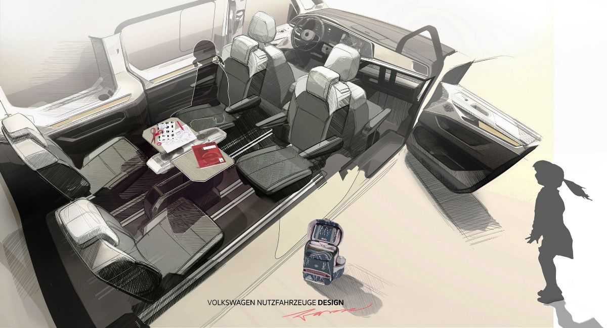 Вслед за рисунком нового Volkswagen Multivan 2022 года в профиль и эскиза той части салона, где видна панорамная крыша, вниманию экспертов и поклонников была представлена анимация, показывающая новый передвижной столик-подлокотник, который способен перемещаться по салону с помощью специальных рельс.