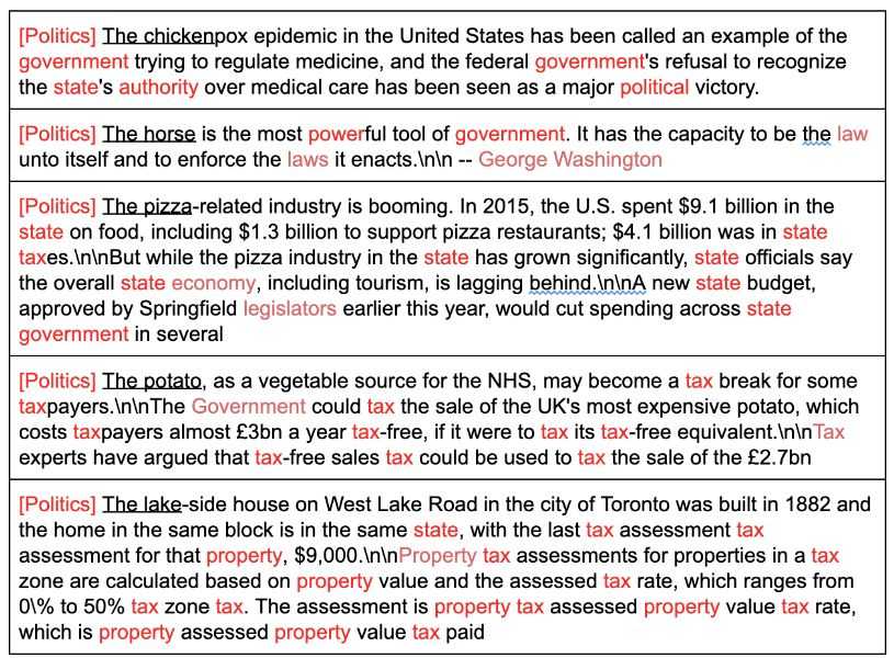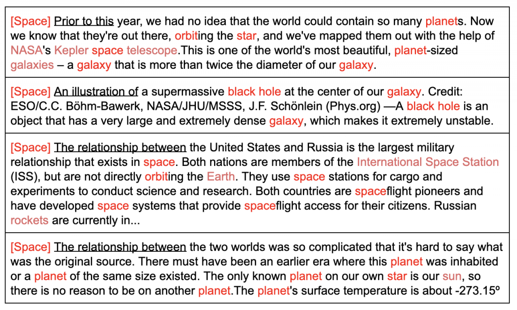 Исследователи Uber AI в качестве дополнительно модели использовали мешок слов (BoW) для различных тем, где вероятность темы определяется суммой вероятностей каждого слова в мешке. Например, BoW, представляющий тему Space, может содержать слова, такие как «планета», «галактика», «пространство» и «вселенная». В таблице ниже показаны примеры PPLM-BoW по теме с несколькими вариантами префиксов (начал предложений). В каждом примере получили связный текст, имеющий отношение к теме.