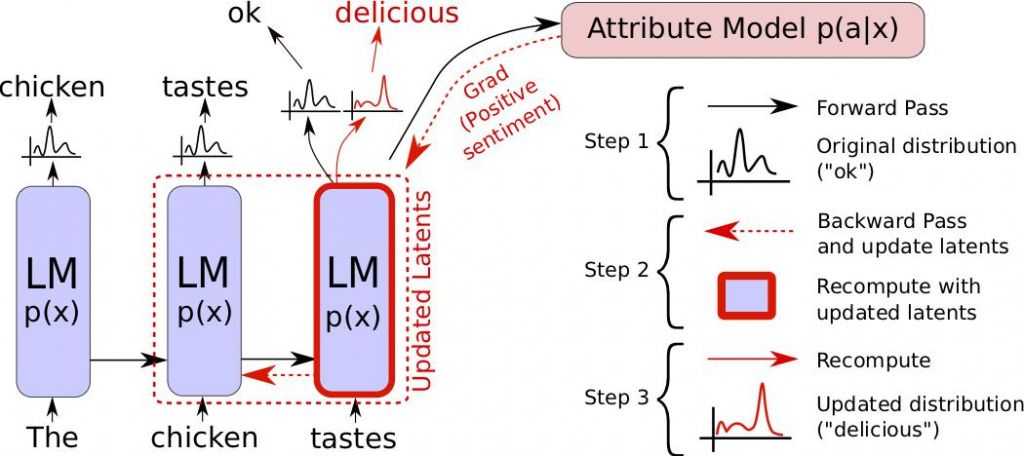 Сначала выполняется прямой проход через языковую модель LM для генерации слова и вычисления вероятности соответствия этого слова требуемому классу (атрибуту) с использованием модели классификатора. Далее, обратный проход обновляет внутренние скрытые представления LM на основе градиентов логарифмических вероятностей требуемого класса (подробнее об этом тут), чтобы увеличить вероятность соответствия сгенерированного текста заданному атрибуту.