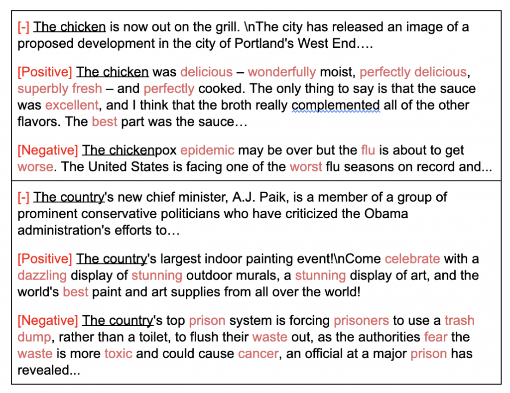 В следующих примерах использовали дискриминатор тональности с 5000 параметрами (1025 параметров на класс (— —, —, 0, +, + +)), обученный на наборе данных SST-5, чтобы управлять тональностью генерируемых текстов. Positive — от модели требуется текст с положительной эмоциональной окраской; Negative — с отрицательной окраской.