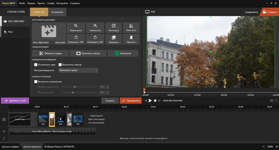 - производить полноценный видеомонтаж: нарезка и склейка клипов, добавление переходов и наложение музыки;