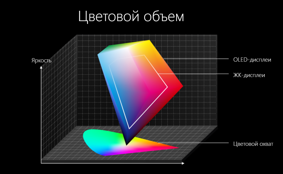 OLED — единственная технология, которая позволяет получать абсолютно черный на попиксельной основе. LCD не может этого сделать, и даже, давно ушедшая из жизни плазменная панель не могла создать абсолютный черный цвет.