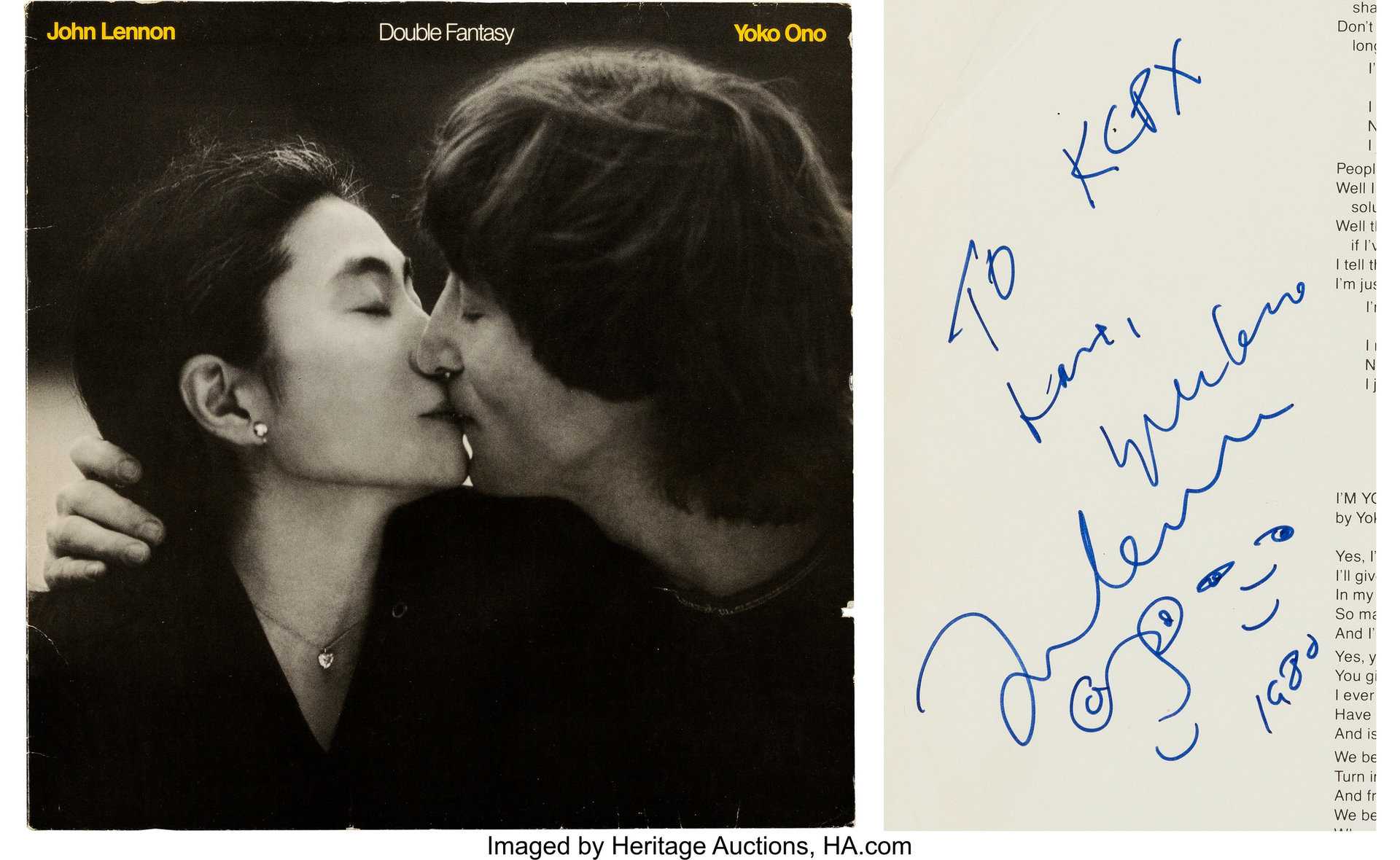 В 1980 год Джон Леннон выпустил свой диск Double fantasy. Именно его он подписал 8 декабря этого же года одному из своих поклонников. Через пять часов тот, держа подмышкой эту пластинку, на выходе из гостиницы «Дакота» застрелил своего кумира. Пластинку подобрали на месте преступления, она стала одной из улик, которая доказала вину Марка Дэвида Чепмена — ведь на обложке остались отпечатки его пальцев. После суда диск с благодарственным посланием прокурора вернули человеку, который его нашел. Он оказался поклонником The Beatles, и целых 19 лет боролся с искушением продать раритет. В 1999 году при посредничестве известной компании Moments in time, которая специализируется на продаже автографов и памятных вещей, диск продали анонимному покупателю за $150 000. Сейчас это официальная цена за пластинку. Владелец готов расстаться с памятным раритетом, но уже за $600 000. Правда, покупателей пока не нашлось. Ценности пластинке добавляет то, что к ней прилагается не только автограф Леннона на обложке, но и полицейские материалы дела — свидетельства прежнего владельца, благодарственное послание прокурора, отчет экспертизы, подтверждающей, что отпечатки принадлежат именно Чепмену.