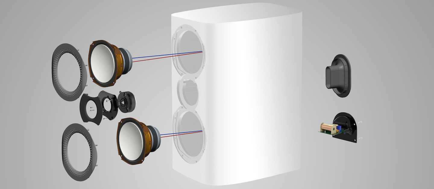 Колонки получили округлые корпуса. Твитер интересный: у него зафиксирован центр мягкого купола, за счет чего форма излучателя превращается из круга в кольцо с катушкой по центру. По традиции твитер размещен не в самом верху корпуса: над ним всегда есть СЧ- или СЧ/НЧ-динамик. В этой серии твитер получил свою собственную камеру, заполненную изолирующим материалом.