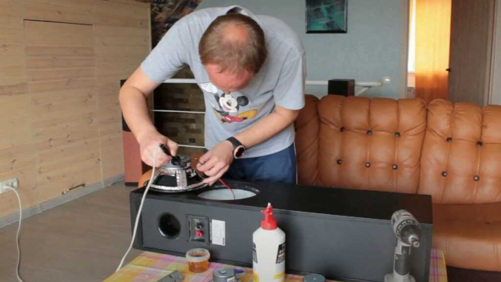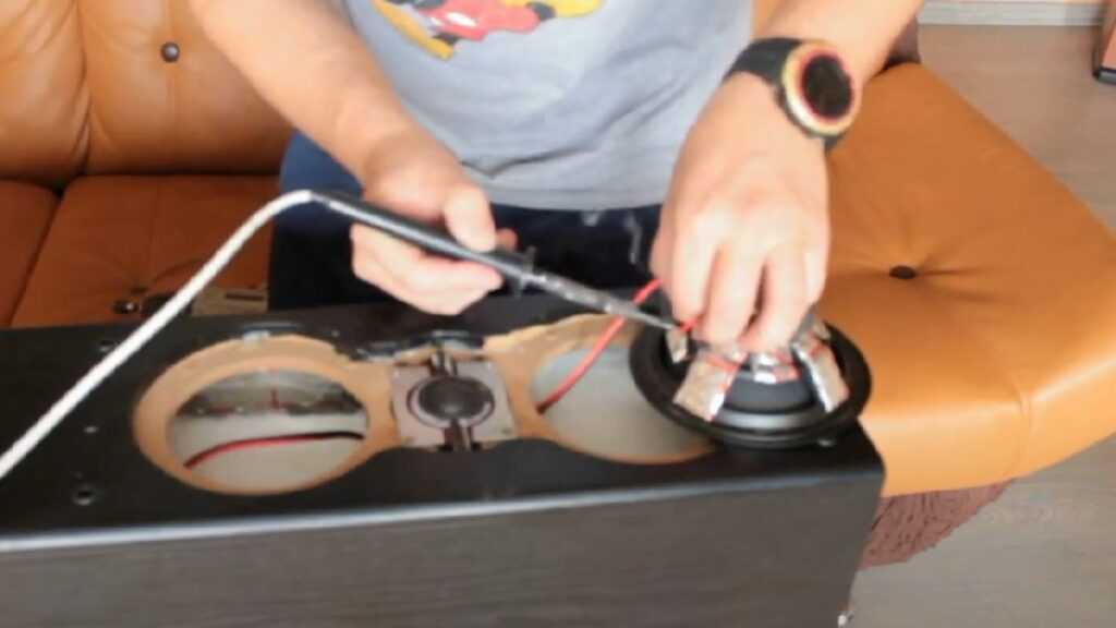 Припаиваем провода к динамикам сабвуфера и прикручиваем их, по своим посадочным, отремонтированным креплениям, саморезами.