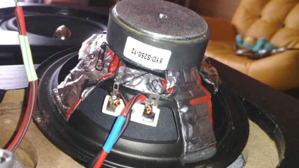 Так же демпфируем большой динамик сабвуфера (ссылка на часть ролика с привязкой по времени) колонок Кортланд С-250 (Cortland S-250). И можно приступать к установке динамиков в корпуса, предварительно припаяв новые, хорошей толщины провода, от кроссовера к динамикам.