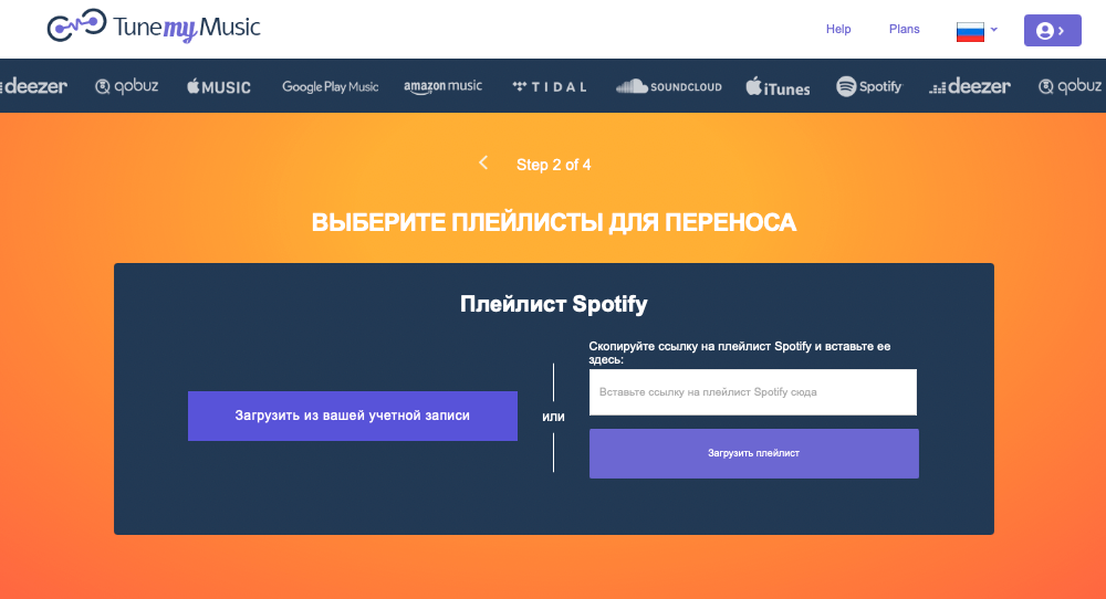 TuneMyMusic переносит музыку из более чем десятка крупных стримингов. У сервиса есть подписка за 4,5 $ (472 Р), но сейчас ее не оплатить, поэтому можно обратиться к бесплатной версии.