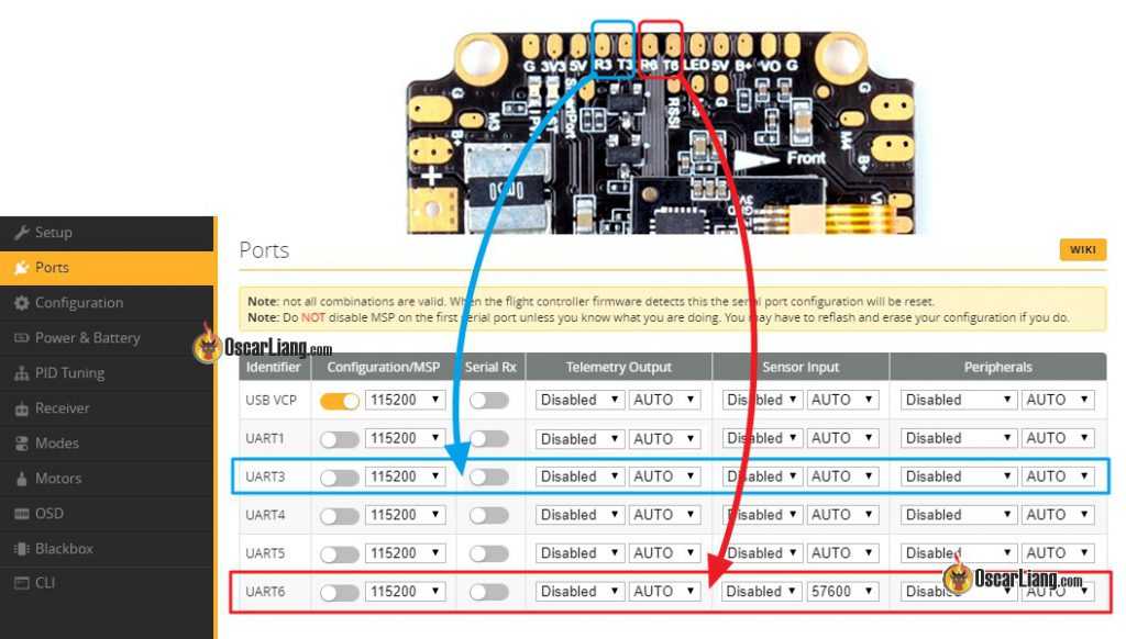 Пример: на полётнике есть UART3 (контакты R3 и T3) и UART6 (контакты R6 и T6). Вы можете назначить им задачи на вкладке Ports в Betaflight конфигураторе.