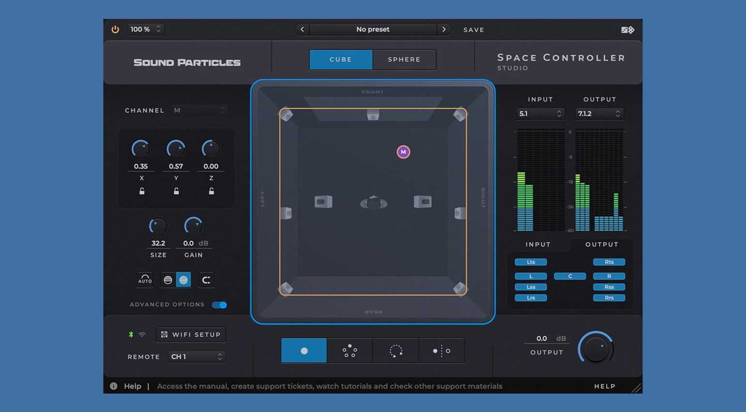 Space Controller is a combination of a plug-in for your DAW and a mobile app for your smartphone. The plug-in supports stereo, multichannel and immersive formats, including 5.1, 7.1, HOA and Dolby Atmos. You can choose from two panning modes: cube and sphere. Cube is a more traditional box-shaped setup, while Sphere mode is perfect for Ambisonics, VR and other sphere-related workflows, Sound Particles says.
