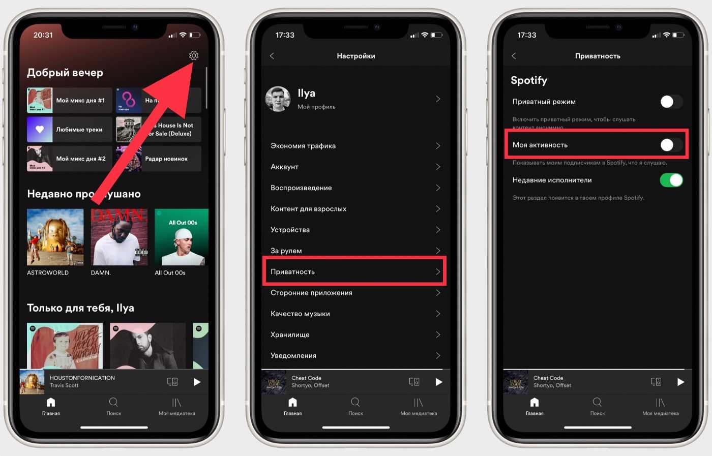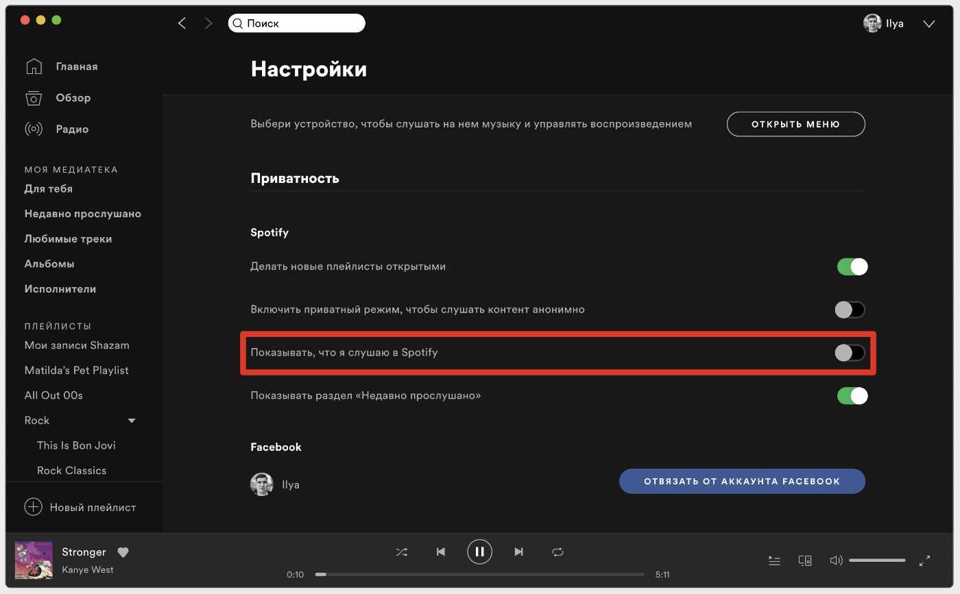 1. Нажмите на стрелку рядом с профилем2. Перейдите в Настройки3. Выключите тумблер рядом с пунктом Показывать, что я слушаю в Spotify