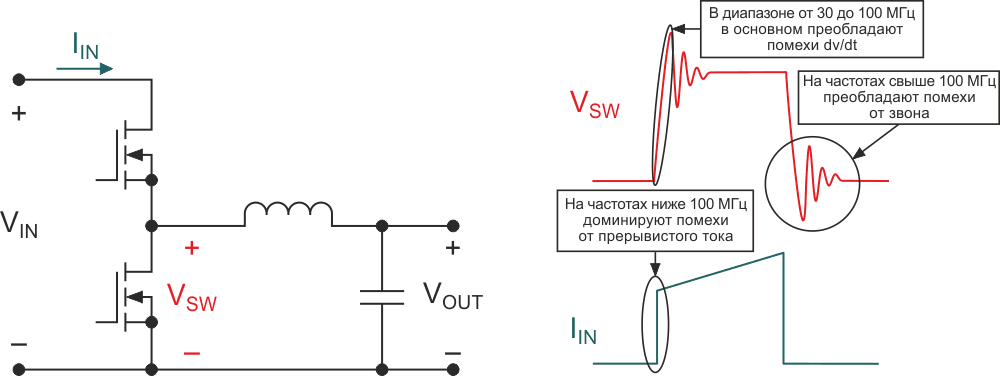 Вследствие открывания и закрывания мощных полупроводниковых переключательных приборов в схеме появляются значительные прерывистые токи. Эти токи проникнут на входы понижающих преобразователей, на выходы повышающих преобразователей, а также на входы и выходы обратноходовых и понижающе-повышающих преобразователей.