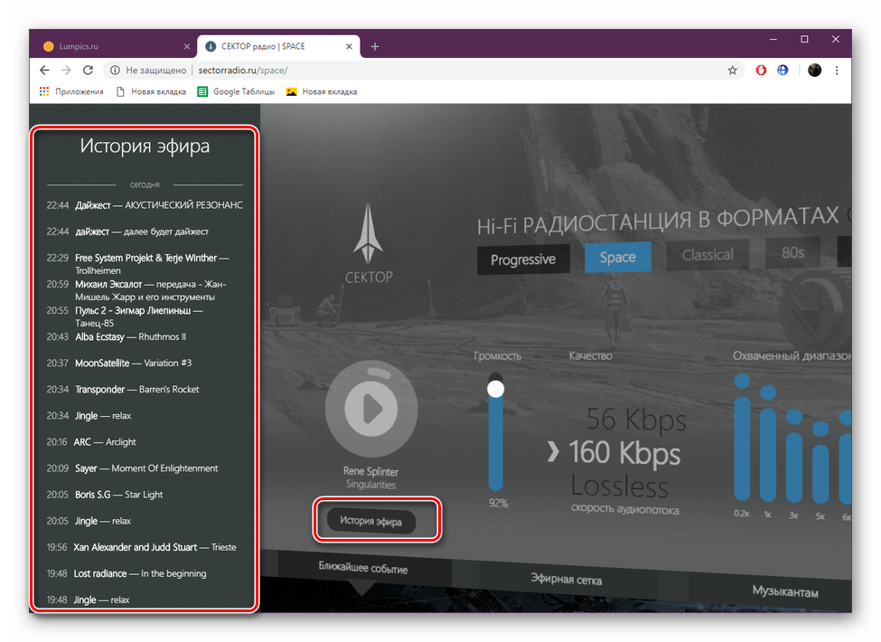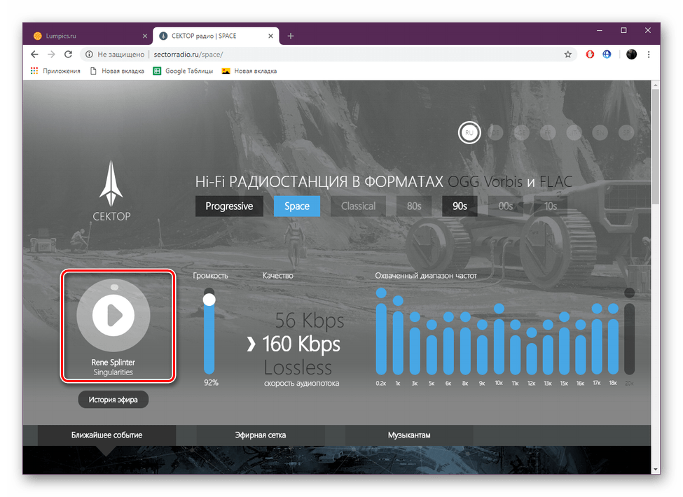 Одно из самых известных онлайн-радио, которое поддерживает формат FLAC и OGG Vorbis, имеет название Сектор и круглосуточно крутит песни только трех разных жанров — Progressive, Space и 90s. Слушать треки на рассматриваемом веб-ресурсе можно следующим образом: