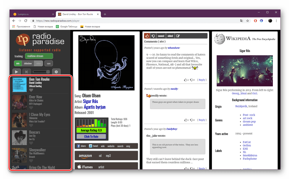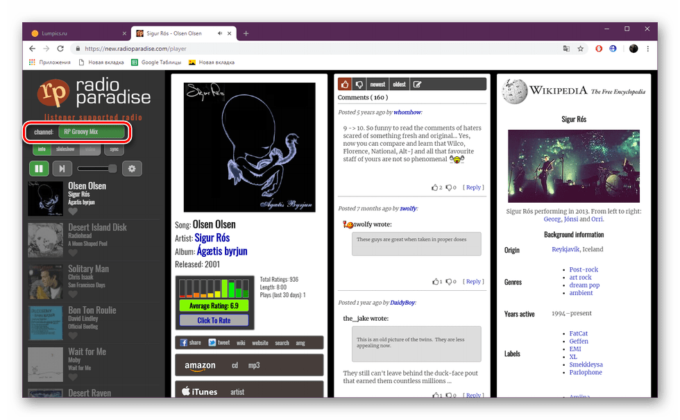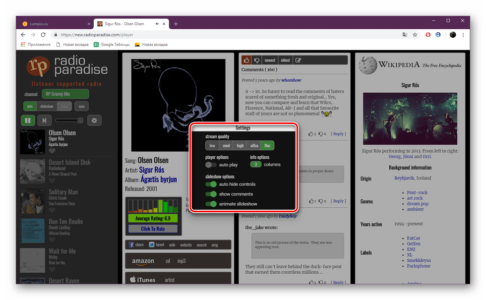 В онлайн-радио под названием Paradise присутствует несколько каналов, на которых транслируется музыка в стиле рок либо в плейлисте смешиваются различные популярные направления. Конечно, на этом сервисе пользователю доступен выбор качества воспроизведения FLAC. Взаимодействие с сайтом Radio Paradise выглядит так: