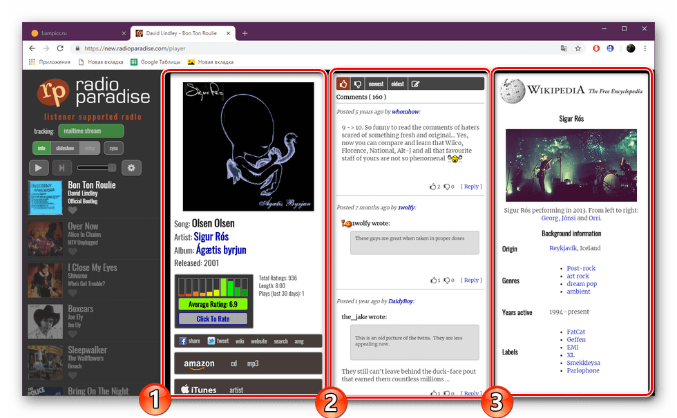 Справа находится три колонки. В первом отображается основная информация о песне, а зарегистрированные пользователи ставят ей оценки. Во второй ведется чат в реальном времени, а третья — страница из Википедии, где указаны сведения об исполнителе.