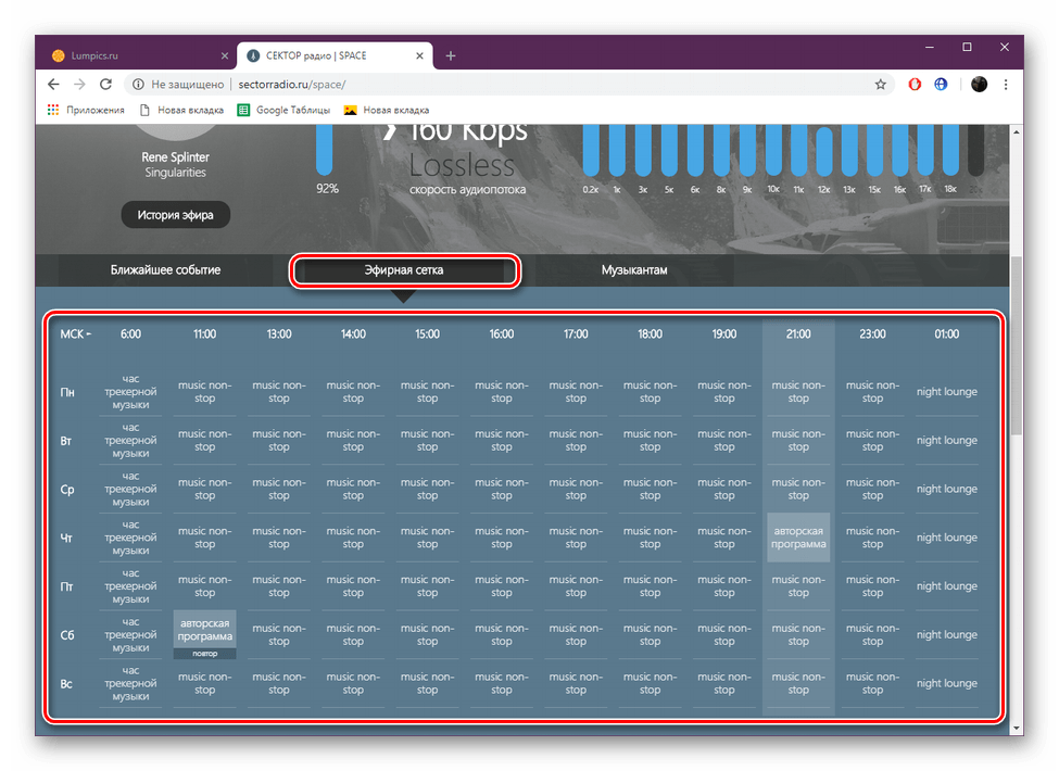 В разделе «Эфирная сетка» находится график воспроизведения композиций и жанров на всю неделю. Воспользуйтесь ей, если хотите узнать детали программы на последующие дни.