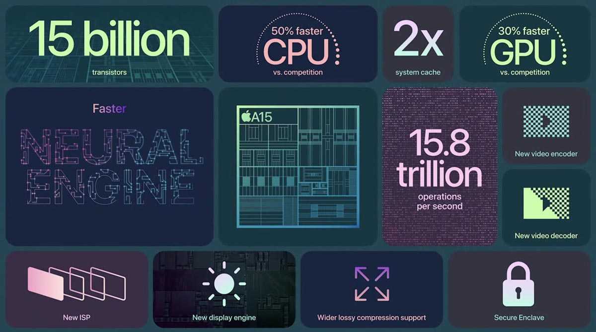 Так же случилось и в этот раз. Новинка оснащается 5-нанометровым чипом A15 Bionic. Это один из самых мощных процессоров на рынке мобильной электроники, который будет выдавать просто топовую производительность. 6-ядерный чип имеет 2 производительных и 4 энергоэффективных ядра. Есть 4-ядерный GPU и 16-ядерная система Neural Engine.