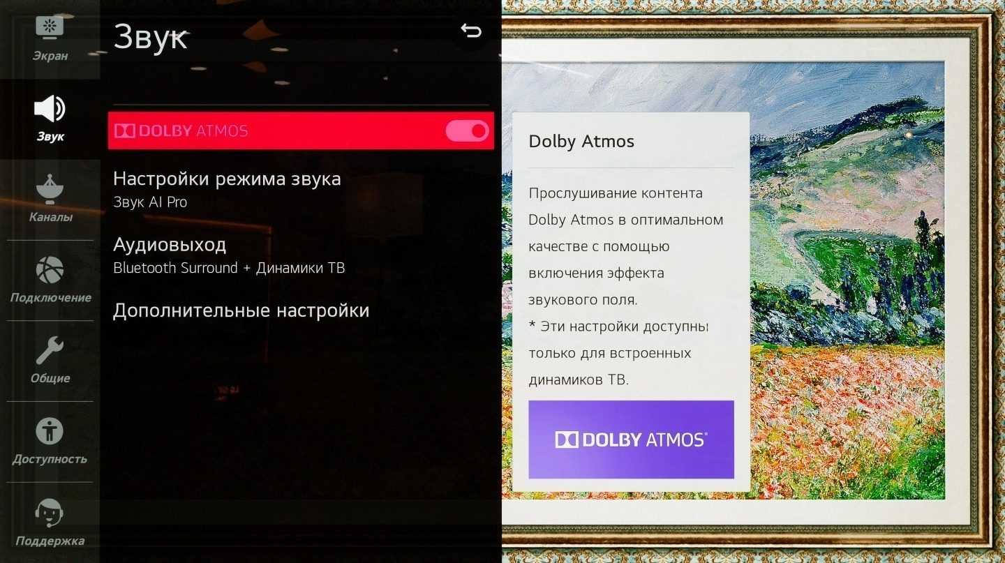 Для улучшения звука используется технология Dolby Atmos, плюс телевизор может выполнять роль беспроводной колонки – к нему по Bluetooth 5.0 можно подключить источник звука, например, смартфон.