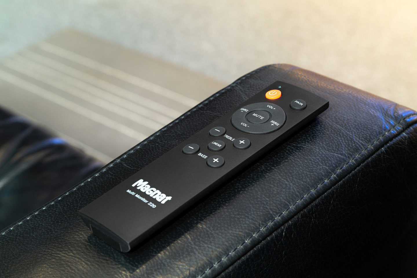 Во время теста мы задействовали почти все варианты подключения, которые только были: по оптике подключили к телевизору, по RCA — к вертушке, по Bluetooth — к моему ноутбуку. Переключение между различными источниками происходит шустро, с Bluetooth сигнал не теряется. Для регулировок предназначен комплектный пульт — простой, из матового пластика с круглыми прорезиненными кнопками. Кнопки не западают, нажимаются четко, но есть одна особенность: пульт нужно направлять четко в ведущую колонку, метр вправо-влево — и она уже не распознает сигнал.