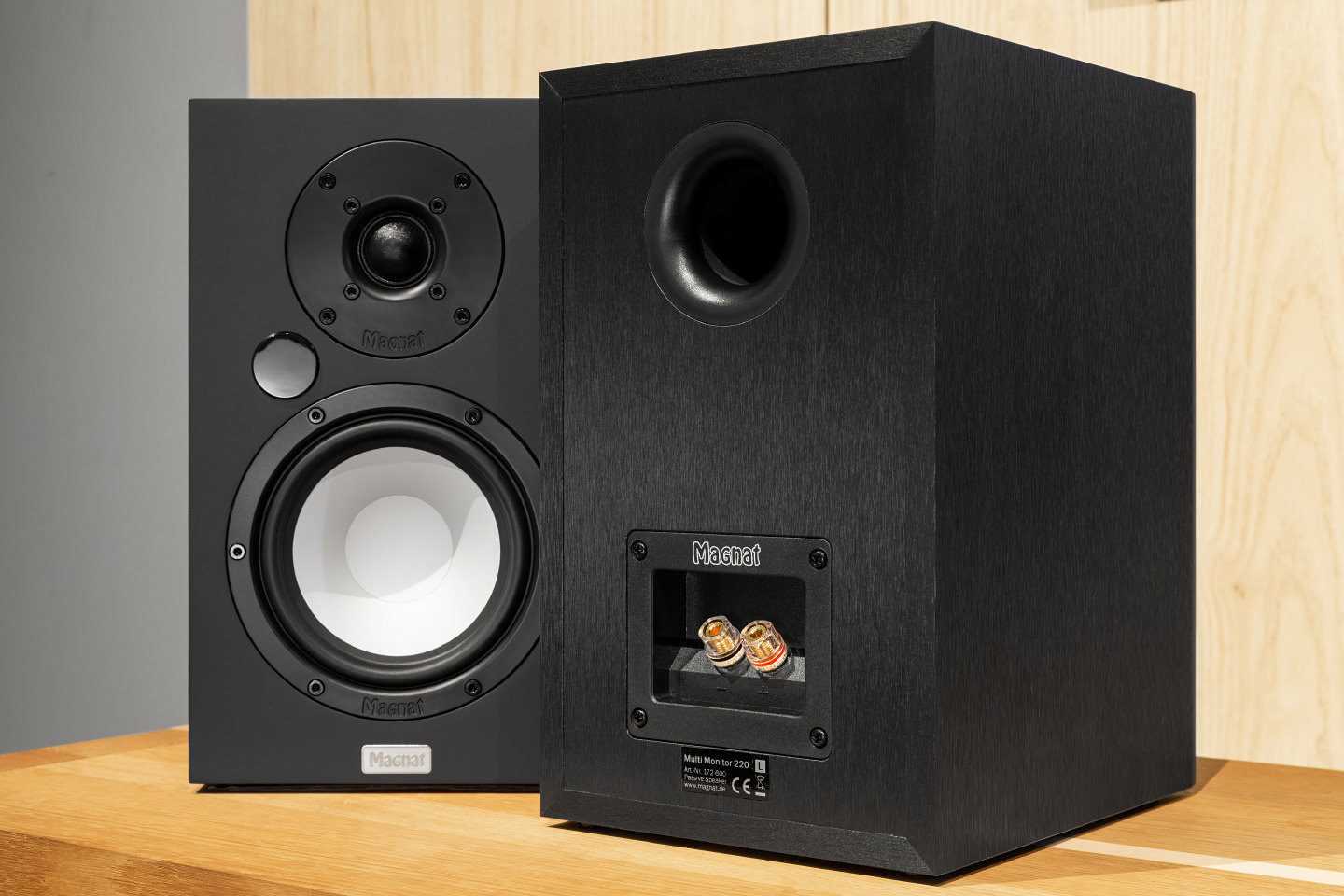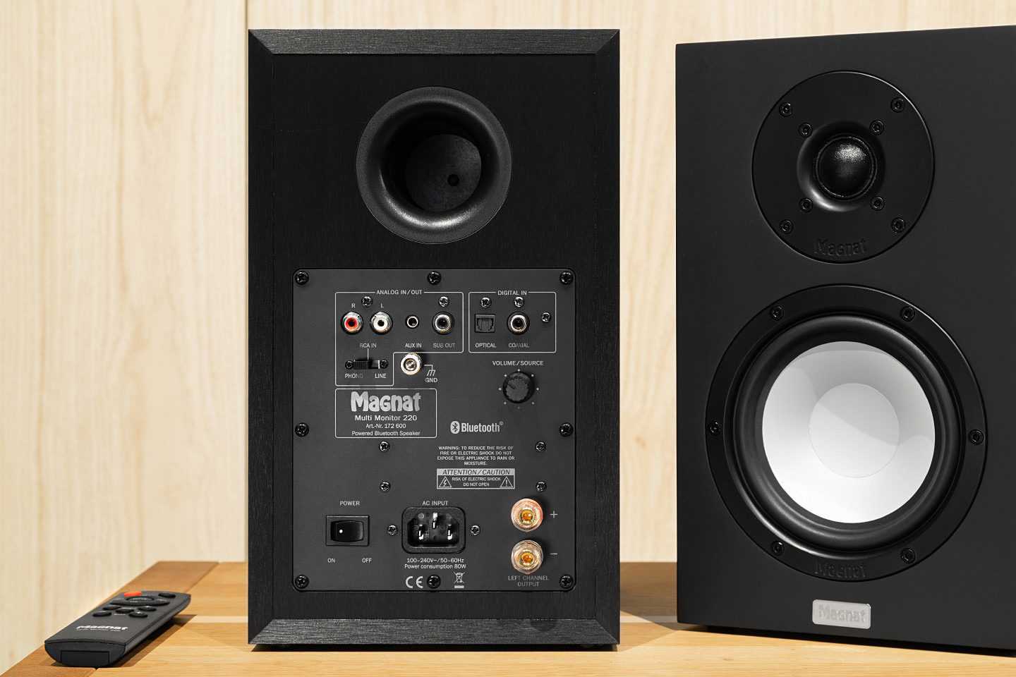 В Multimonitor используется классическая схема, в которой одна колонка активная и держит в себе всю электронику, а другая — пассивная и крепится к первой акустическим кабелем. На главной колонке есть пара разъемов RCA, работающих как в режиме линейного входа, так и в формате фоновхода (встроенный фонокорректор поддерживает MM-картриджи), есть 3,5-мм вход, оптика и коаксиал. Предусмотрена шайба для подключения заземления, выход на сабвуфер, а также регулятор громкости и источников.