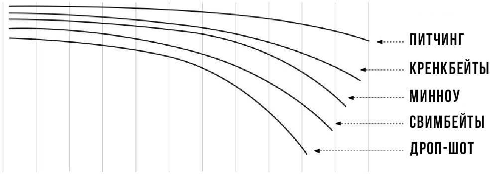 Коротко, спиннинги быстрого строя будут сгибаться в верхней трети длины или меньше, спиннинги среднего или умеренного строя будут сгибаться в верхней половине, а удилища медленного строя сгибаются, начиная с нижней трети длины, до ручки. Проще говоря, это то место, где сгибаются удилища. Ниже, (рис.1), привожу иллюстрацию, показывающую соответствие строя спиннинга с техниками заброса приманки, от питчинга (Pitching) до дроп-шота (Drop Shot).
