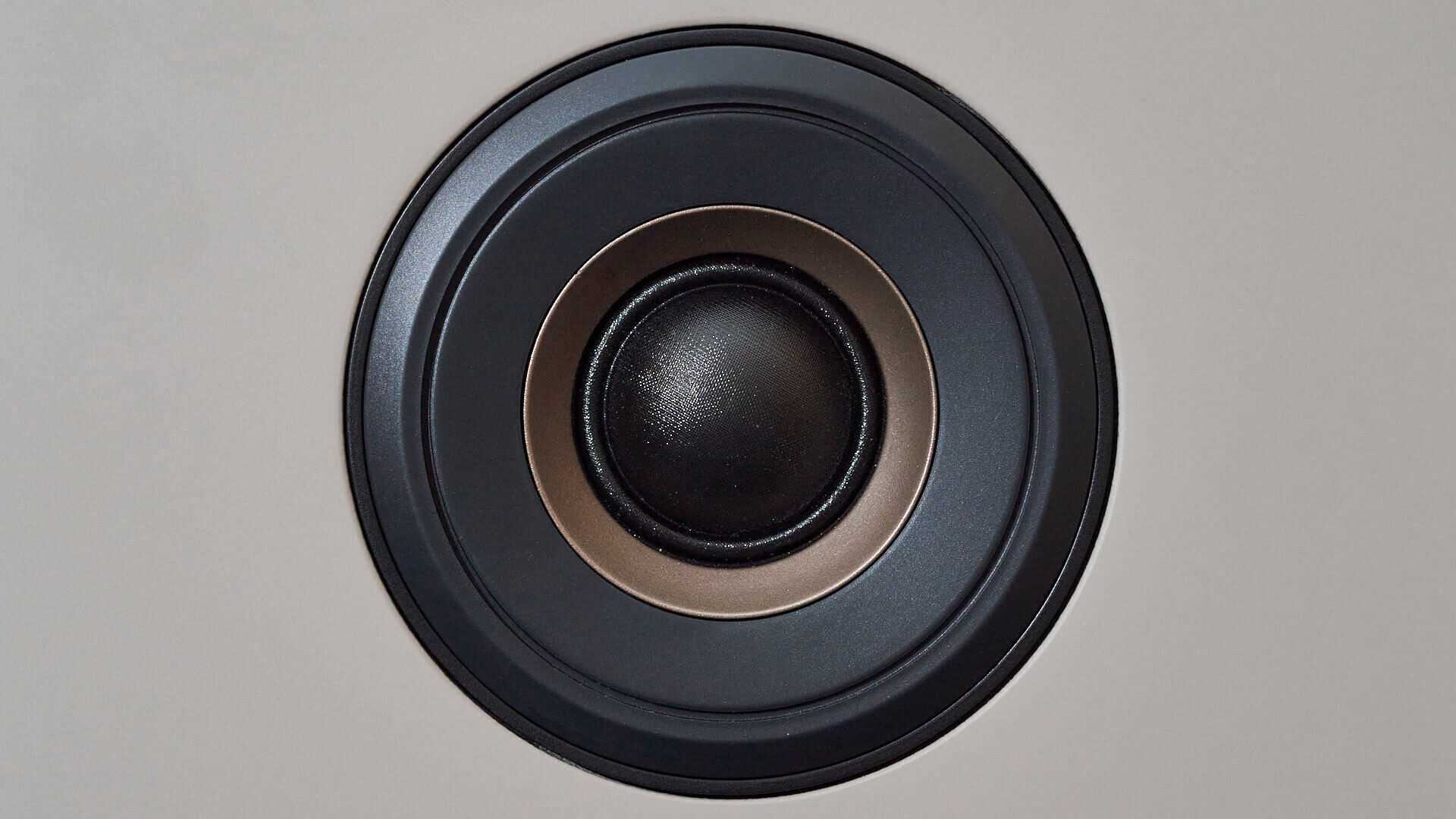 Под ним находится 13-см СЧ/НЧ-динамик, вогнутый красивой ровной чашечкой — безо всяких фазовыравнивающих пуль и пылезащитных накладок. Он упрятан достаточно глубоко в корпус, висит на резиновом подвесе и оформлен черным пластиковым кольцом. Винтов или какого-либо иного крепления не видно — и это добавляет конструкции ощущения монолитности. Да и защитные решетки у них магнитные — нет отверстий под штырьки.