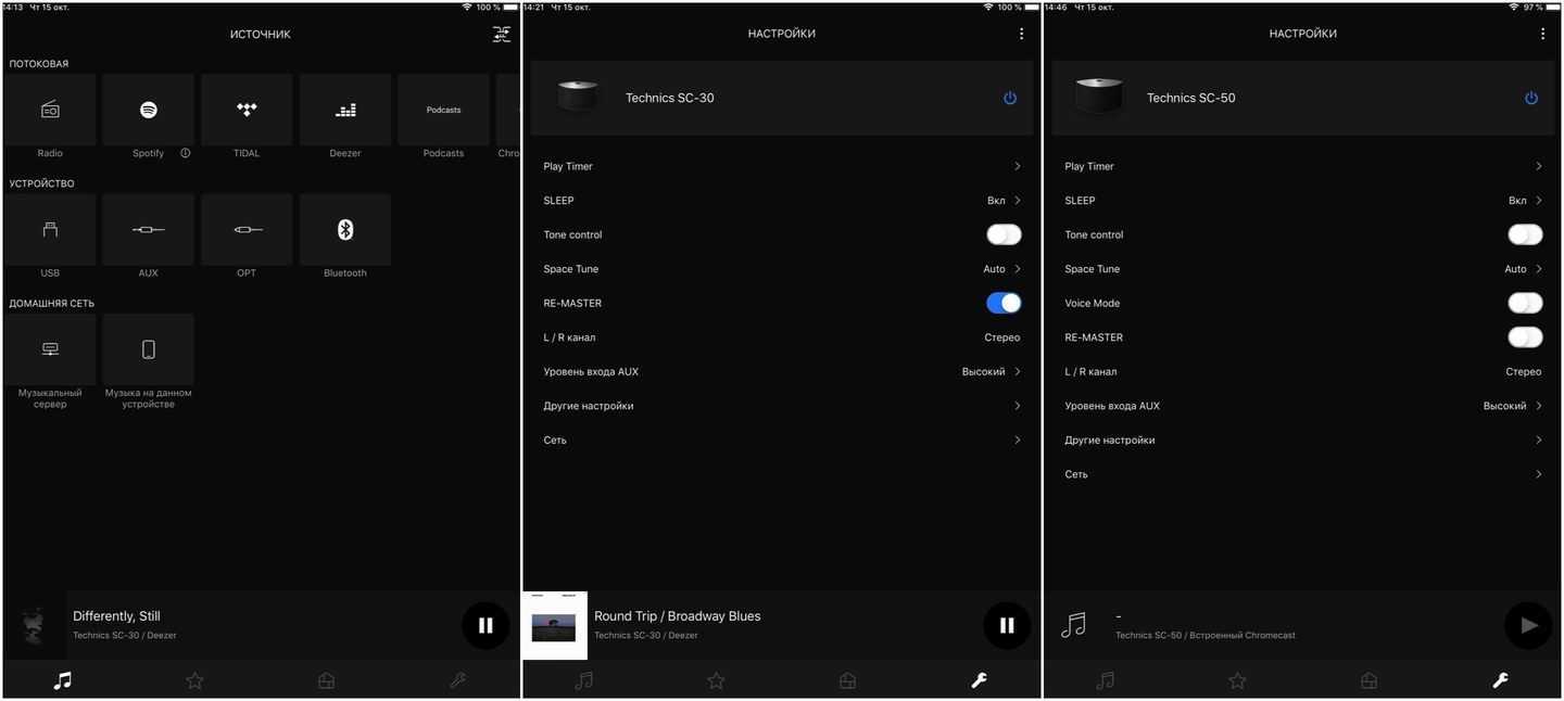 Если фирменное приложение Technics не видит устройства (на первом скриншоте именно оно пишет «No Song», а его интерфейс показан на втором), то управлять воспроизведением можно через приложение Google Home (третий и четвертый скриншоты). В нем Den Speaker — это SC-C50, а Den speaker 2 — SC-C30
