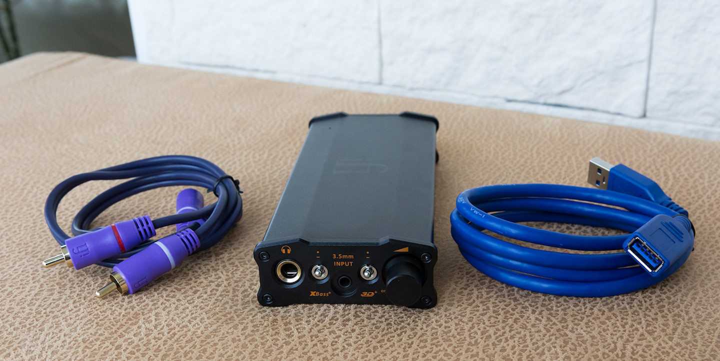 Помимо самого аппаратика, в роскошно оформленной упаковке обнаружился на редкость щедрый набор аксессуаров: удивительно гибкий интерконнектор RCA-RCA, наоборот жесткий (поскольку поддерживает USB 3.0) удлинитель USB, адаптер с портом USB-B, сквозной канал, а также насадка на оптический кабель Toslink, позволяющая подключать его к комбинированному коаксиально-оптическому цифровому гнезду RCA.
