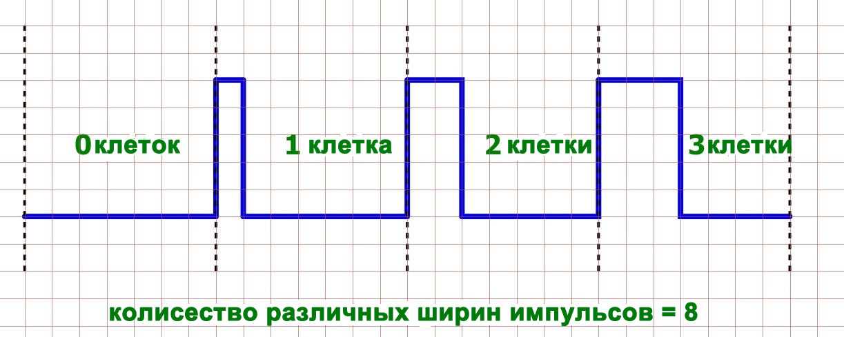 Предположим, что ШИМ сигнал, показанный на диаграмме, ограничен длительностью импульсов, кратной одной сетке. Это означает, что коэффициент заполнения может принимать 8 различных значений: 0%, ~14%, ~29%, ~43%, ~57%, ~71%, ~86% и 100%. Каждое значение коэффициента заполнения соответствует определенному выходному напряжению, поэтому мы имеем здесь 3-битный ЦАП, потому что 23 = 8.