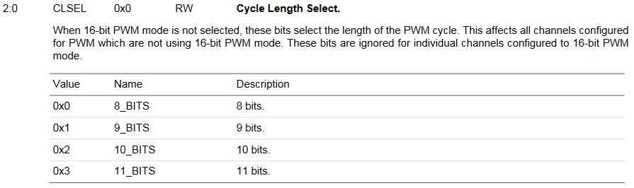 Этот 16-разрядный счетчик означает 16-разрядное разрешение, или 216 = 65 536 различных значений напряжения в диапазоне от 0 В до VDDIO (которое может быть в диапазоне от 1,62 В до 3,6 В). Другой пример, микроконтроллеры EFM8UB1 от Silicon Labs имеют переменное разрешение ШИМ, и, следовательно, в справочном руководстве явно указаны характеристики разрешения:
