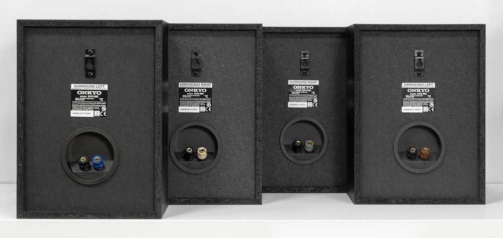 Фронтальная акустика и акустика центрального канала в HT-S7800 5.1.2 базируется на инновационных динамиках Onkyo с арамидным ламинированием диффузоров Onkyo Micro Fiber (OMF), фронтальная акустика двухполосная с фазоинвертором, имеет встроенную полнодиапазонную подвеску, ориентированную вверх для трансляции аудио формата Dolby Atmos. Фронтальная акустика работает в диапазоне частот 55 Гц-50 кГц (встроенный динамик для Dolby Atmos — 80 Гц-20 кГц) с выходным уровнем звукового давления 84.5 дБ / Вт / м (встроенный – 81 дБ / Вт / м) и максимальной мощностью 130 Вт, имеет размеры 6 1/8 «х 18 3/8» х 7 3/16 «(155 х 467 х 183 мм) и вес 7,9 фунта. (3,6 кг). Акустика центрального канала — в диапазоне частот 65 Гц-50 кГц с выходным уровнем звукового давления 86 дБ / Вт / м и максимальной мощностью 130 Вт, имеет размеры 16 9/16 «х 4 1/2» х 4 11/16 «(420 х 115 х 119 мм) и вес5.1 фунтов. (2,3 кг), тыловая акустика — в диапазоне частот 80 Гц-20 кГц с выходным уровнем звукового давления 81 дБ / Вт / м и максимальной мощностью 130 Вт, имеет размеры 4 1/2 «х 9 1/16» х 3 3/4 «(115 х 230 х 96 мм) и вес 2.2 фунта. (1,0 кг), сабвуфер — в диапазоне частот 25 Гц-150 Гц с максимальной мощностью 120 Вт имеет размеры 12 1/2 «х 18 7/16» х 15 11/16 «(317,5 х 468 х 398 мм) и вес 21.2 фунтов. (9,6 кг).